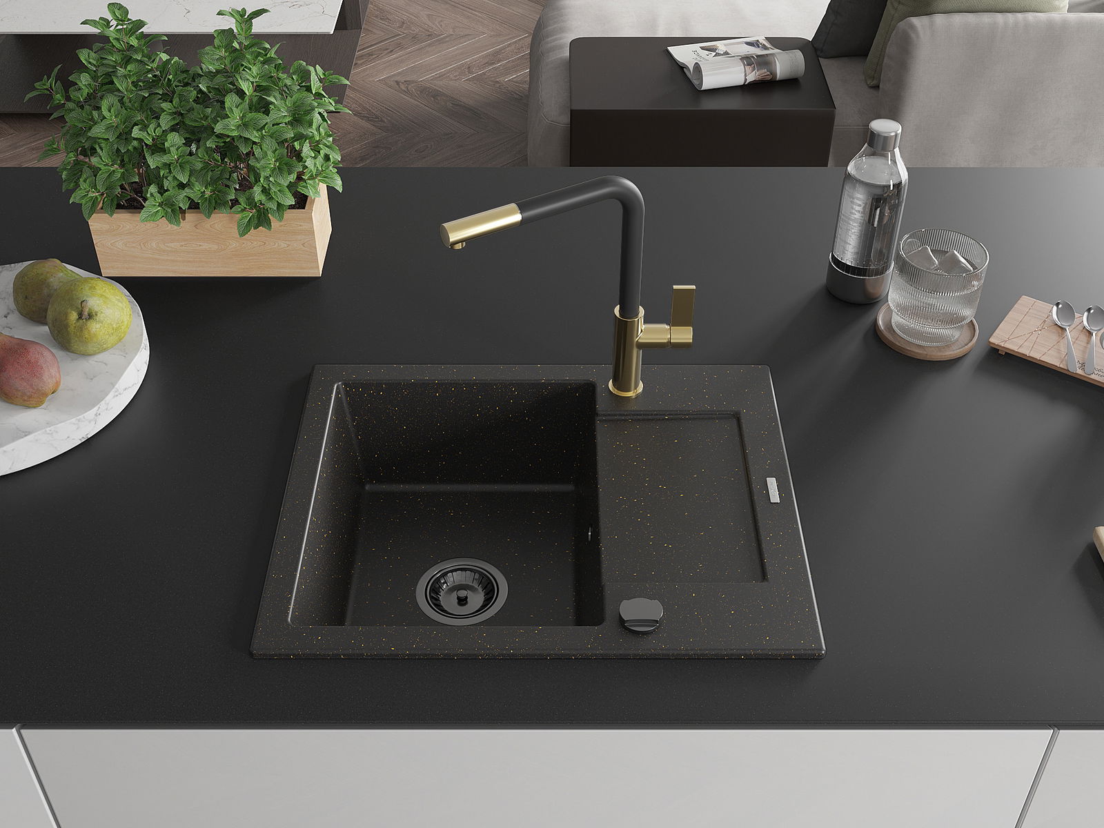 Mexen Enzo évier en granit 1 bac avec égouttoir et robinet de cuisine Flora, noir/or métallique - 6506-75-670401-57-B
