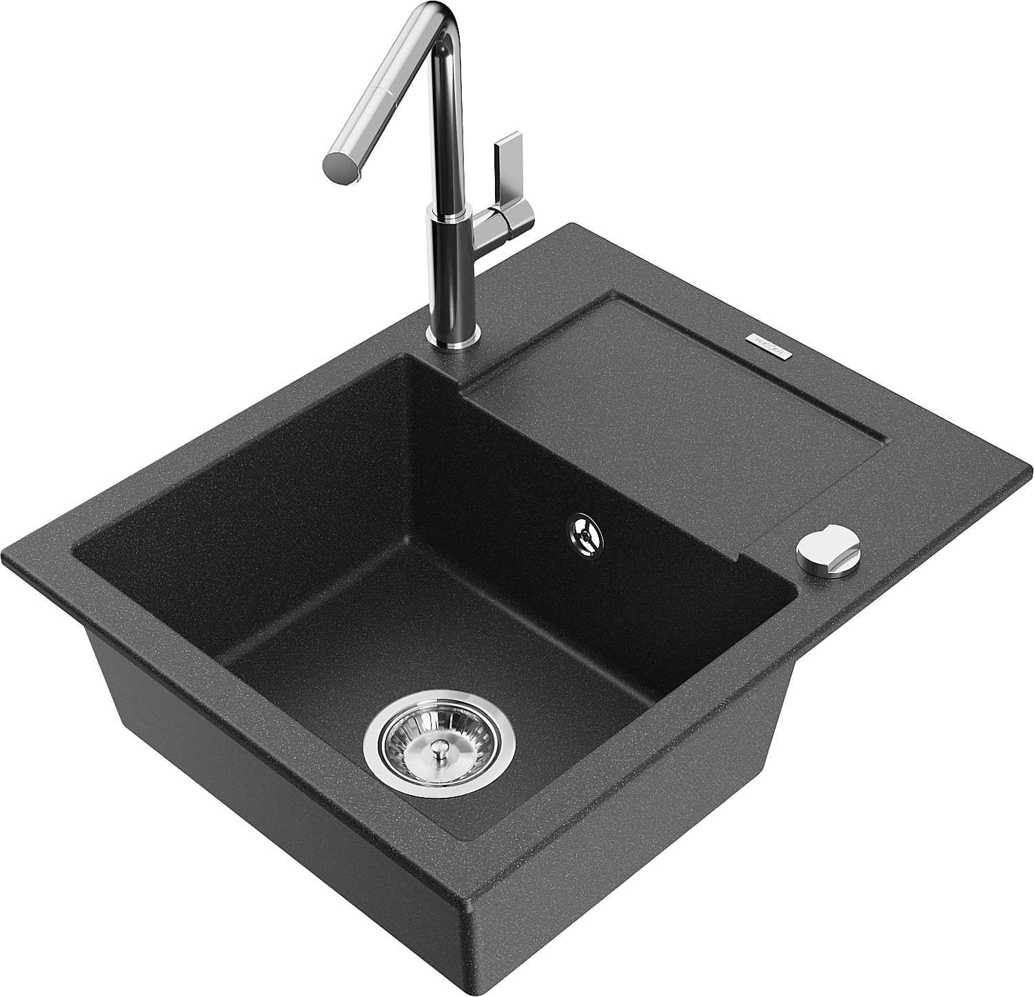 Mexen Enzo évier en granit à 1 bac avec égouttoir et robinet de cuisine Flora, noir moucheté - 6506-76-670401-00