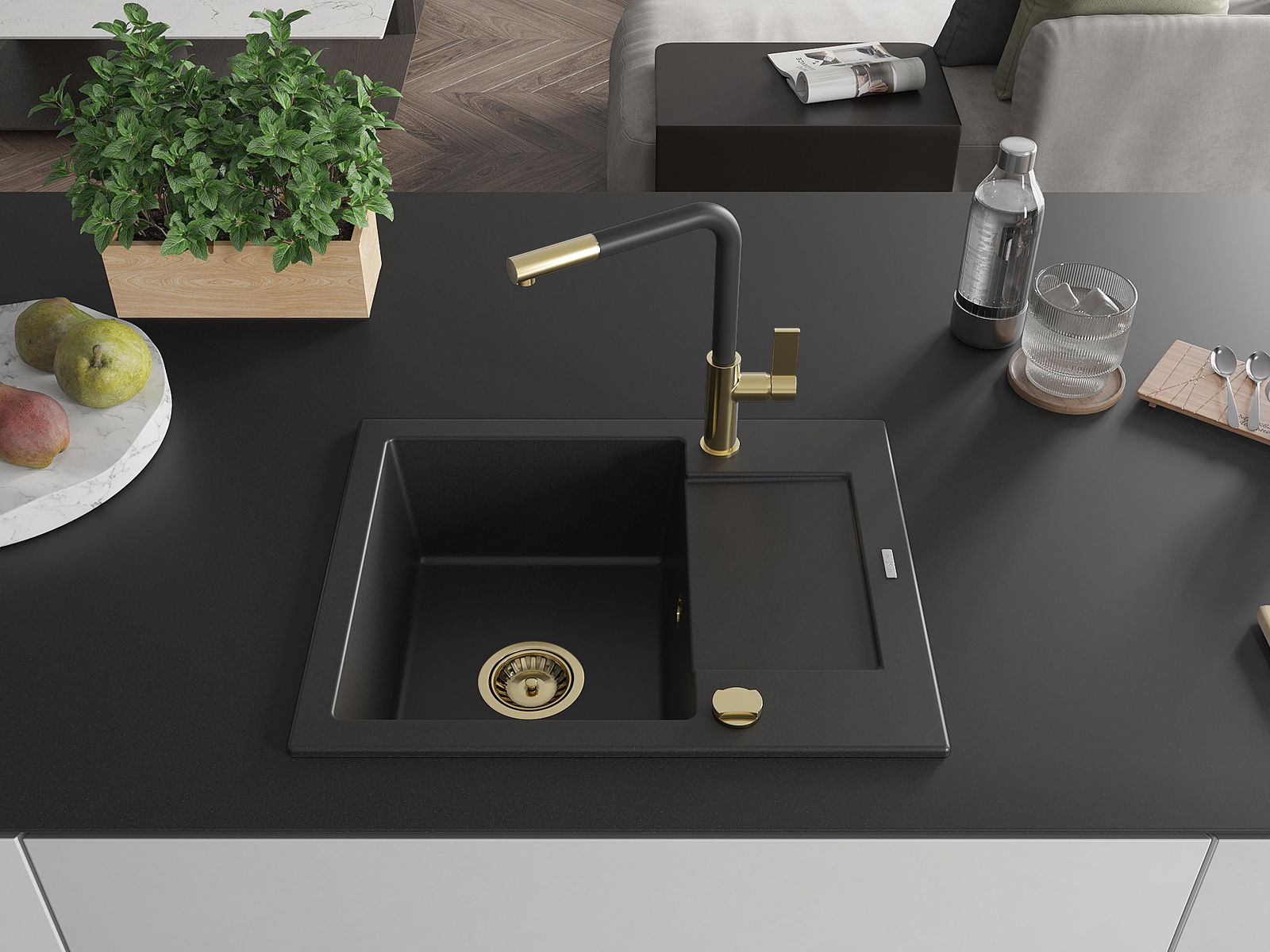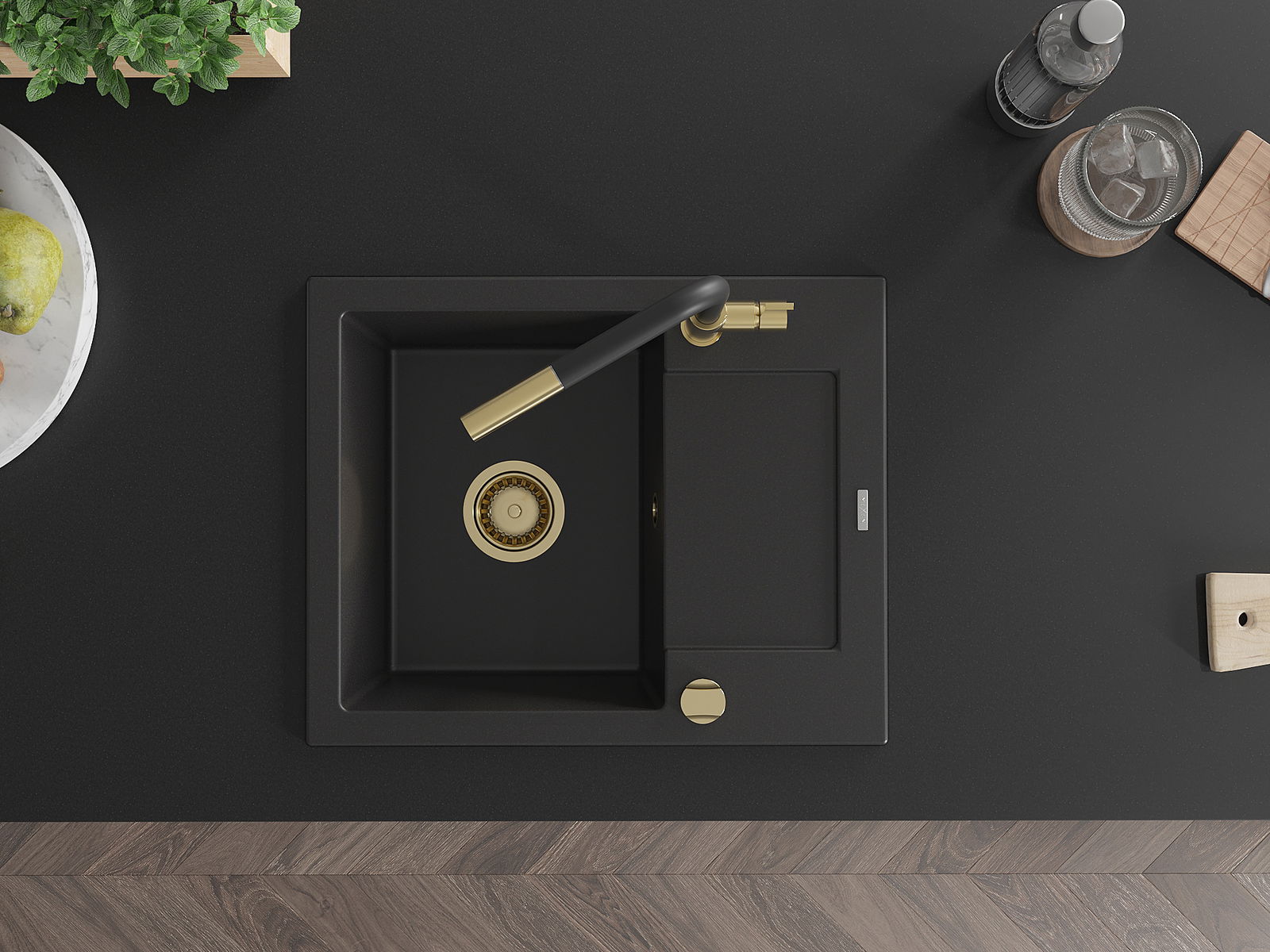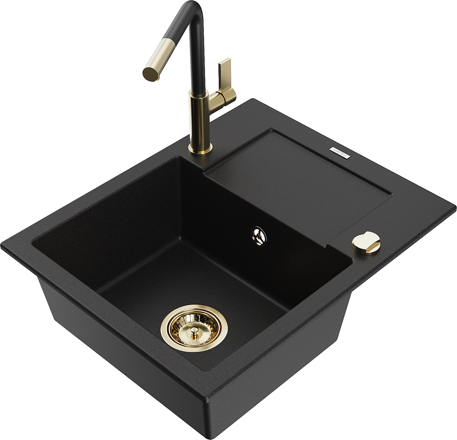 Mexen Enzo évier en granit 1 bac avec égouttoir et robinet de cuisine Flora, noir - 6506-77-670401-57-G