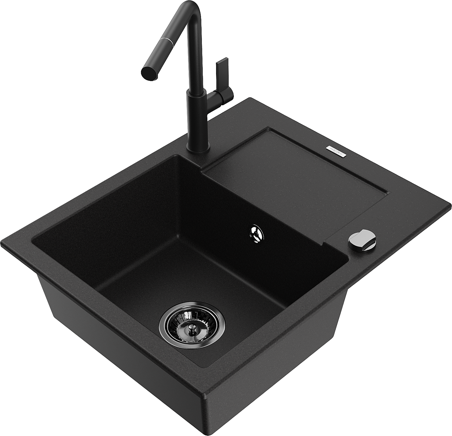 Mexen Enzo évier de cuisine en granit à 1 bac avec égouttoir et mitigeur Flora, noir - 6506-77-670401-70-B