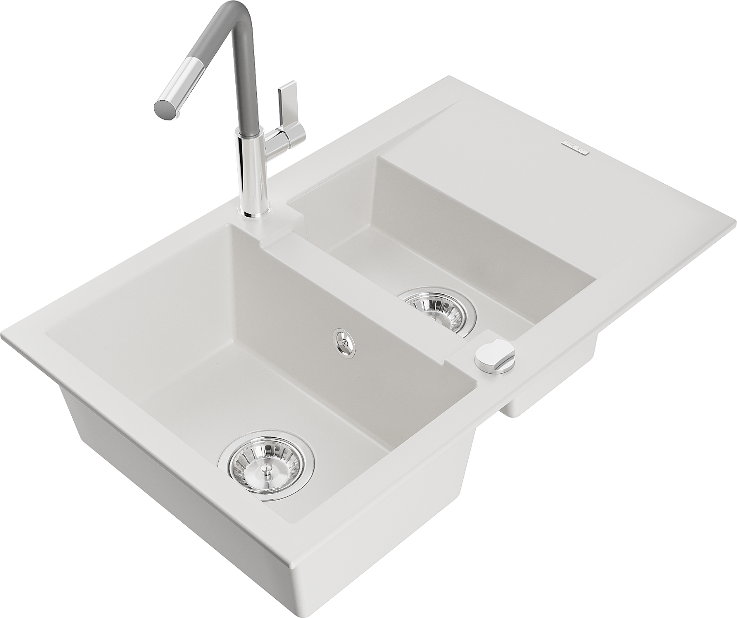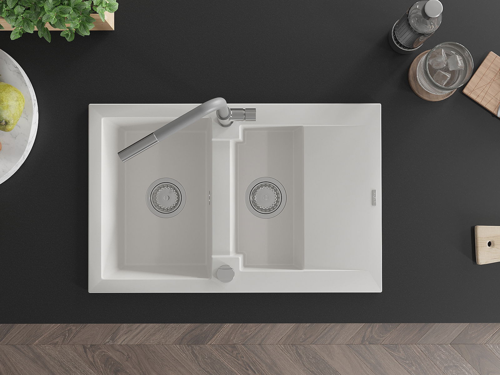 Mexen Gaspar évier en granit 1,5 bac avec égouttoir et robinet de cuisine Flora, blanc - 6507-20-670401-06