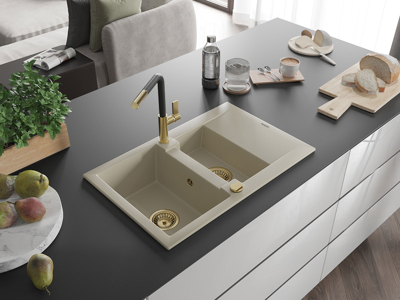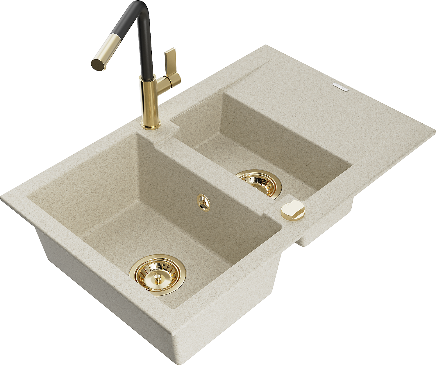 Mexen Gaspar évier de cuisine en granit à 1,5 bac avec égouttoir et robinet de cuisine Flora, beige - 6507-69-670401-57-G