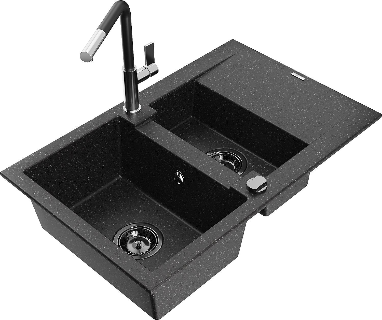 Mexen Gaspar évier en granit à 1,5 bac avec égouttoir et mitigeur de cuisine Flora, noir/argent - 6507-73-670401-07-B