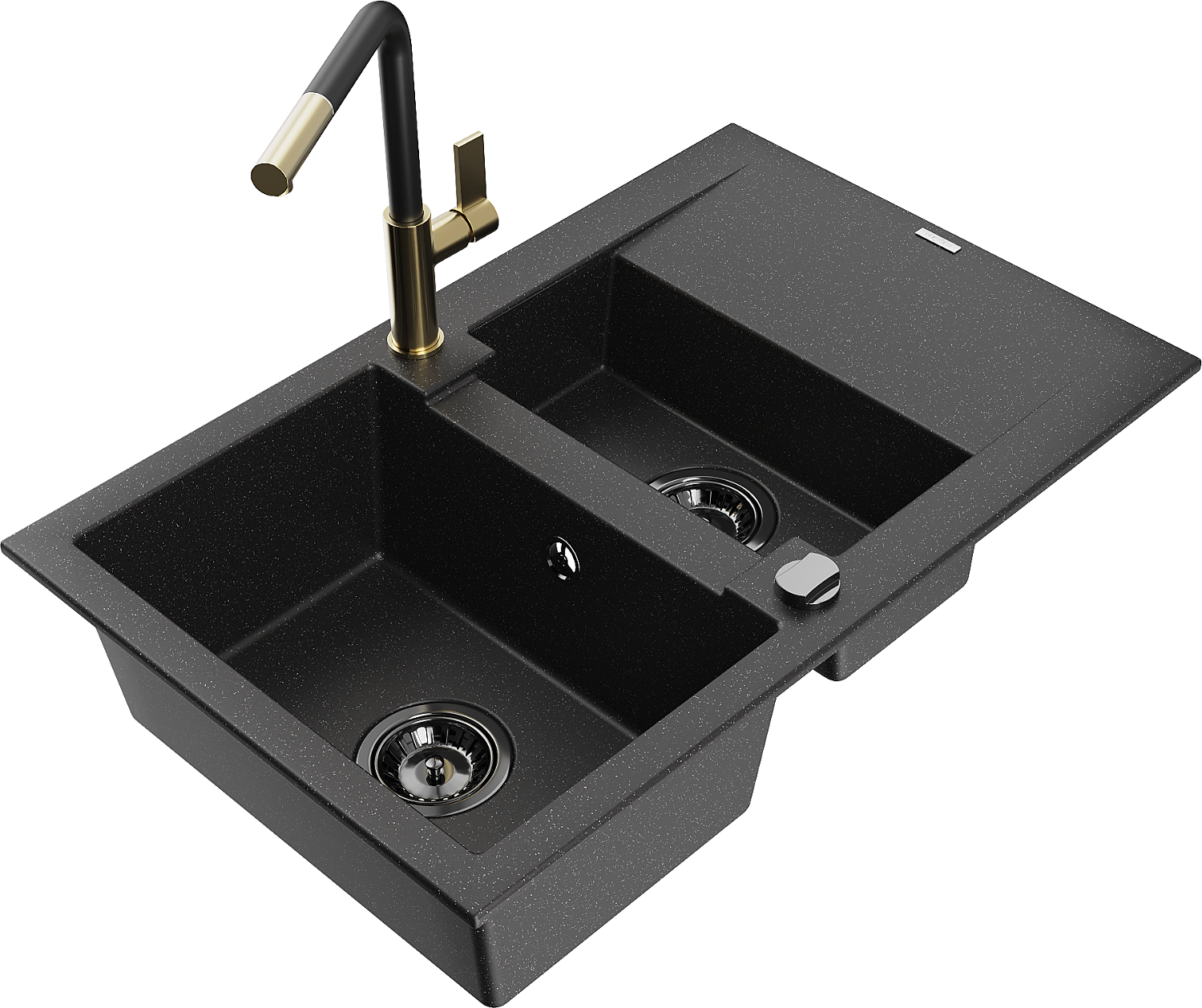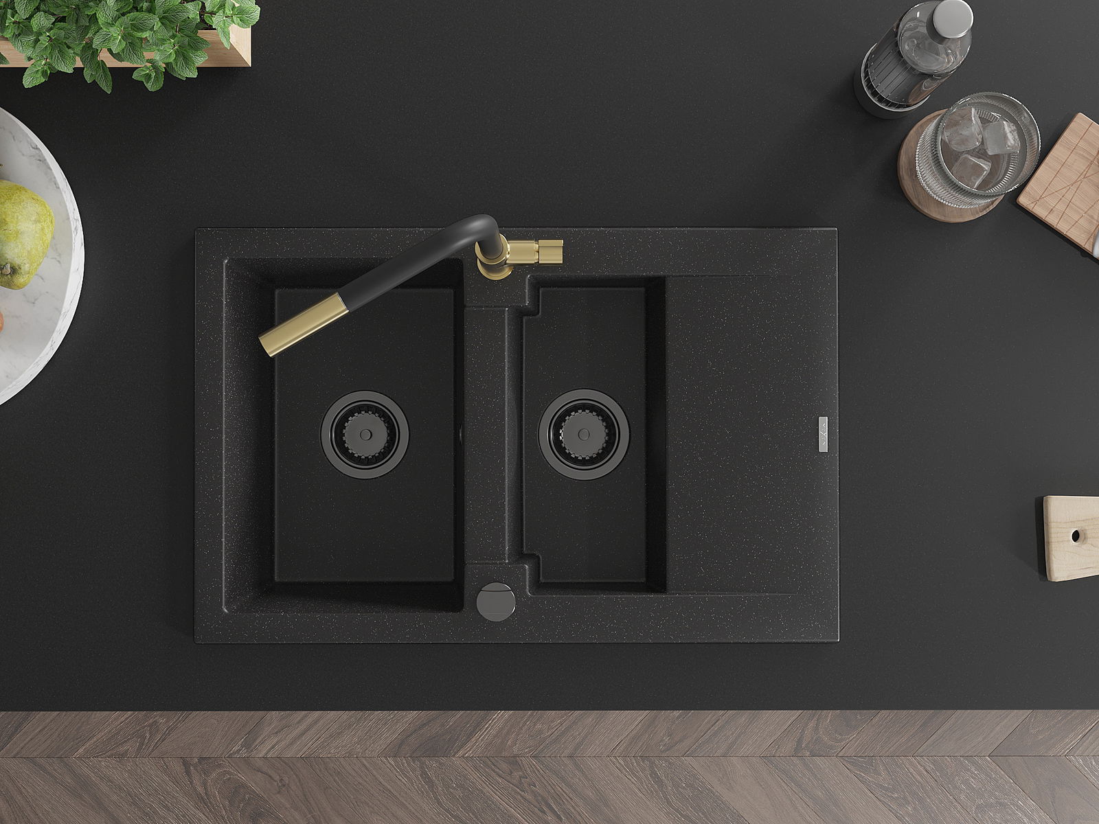 Mexen Gaspar évier en granit 1,5 bac avec égouttoir et mitigeur de cuisine Flora, noir/argent - 6507-73-670401-57-B