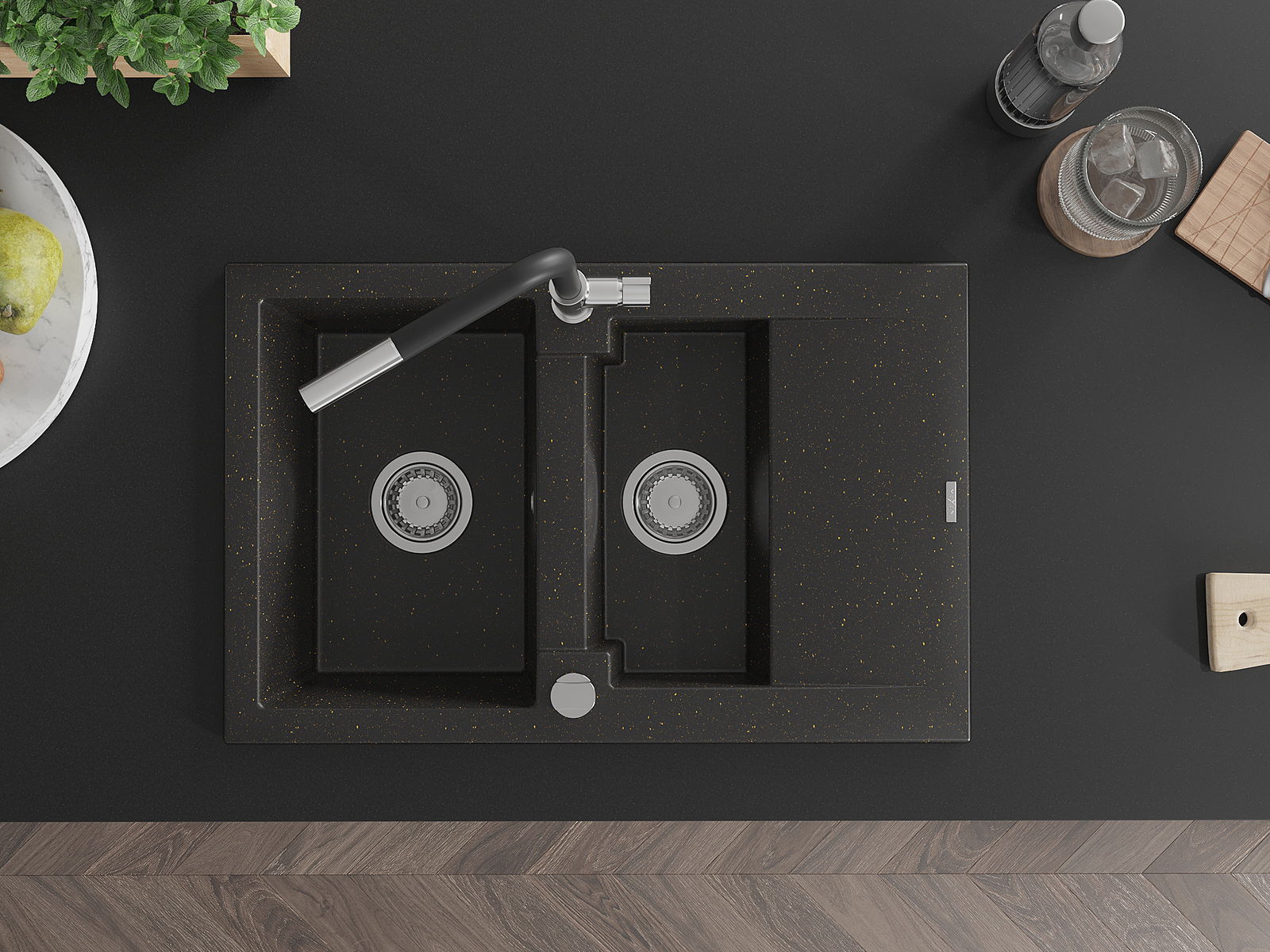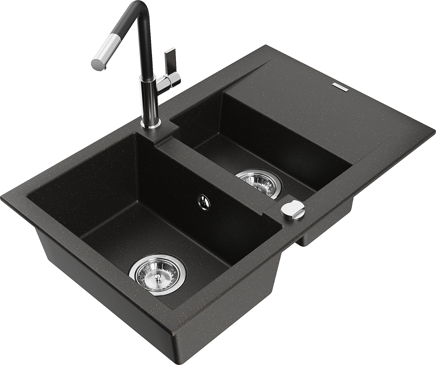Mexen Gaspar évier en granit 1,5 bac avec égouttoir et robinet de cuisine Flora, noir/métallisé or - 6507-75-670401-07
