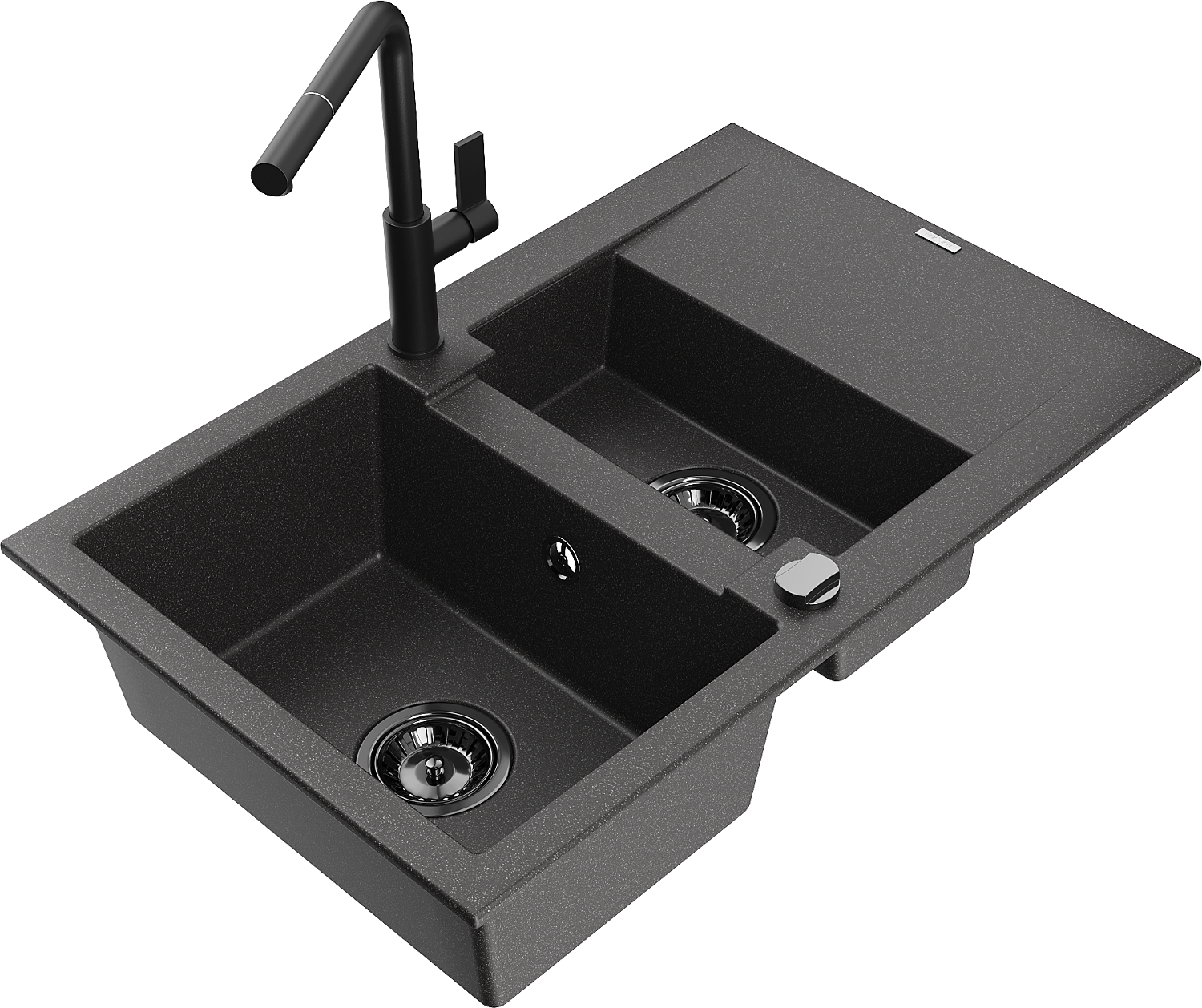Mexen Gaspar évier en granit 1,5 bac avec égouttoir et mitigeur de cuisine Flora, noir moucheté - 6507-76-670401-70-B