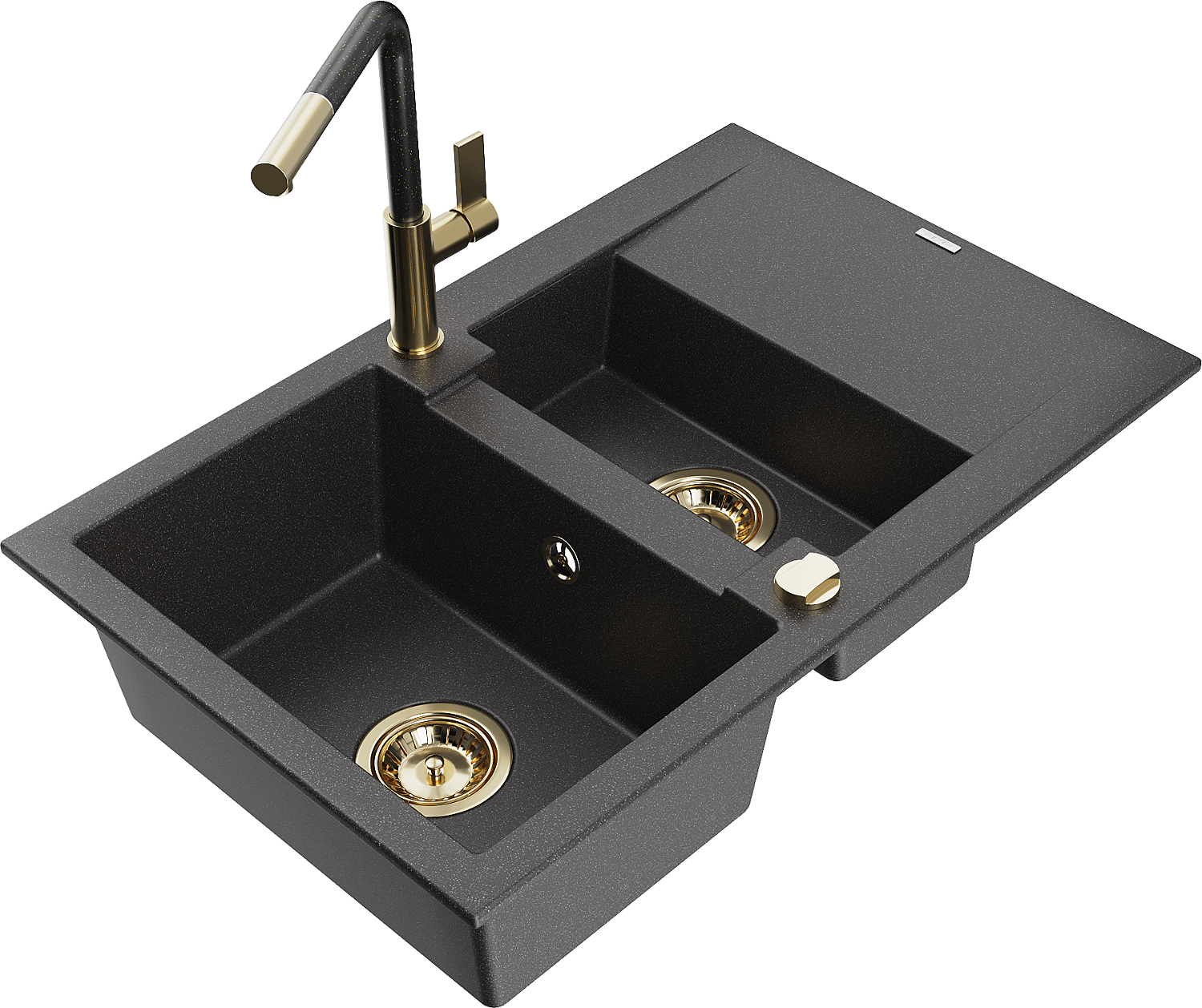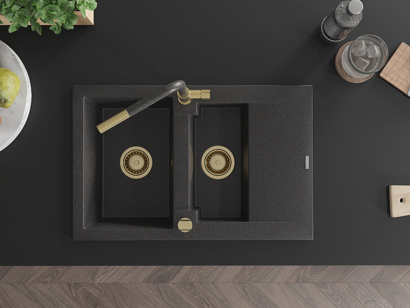 Mexen Gaspar évier en granit 1,5-bacs avec égouttoir et robinet de cuisine Flora, noir moucheté - 6507-76-670401-75-G