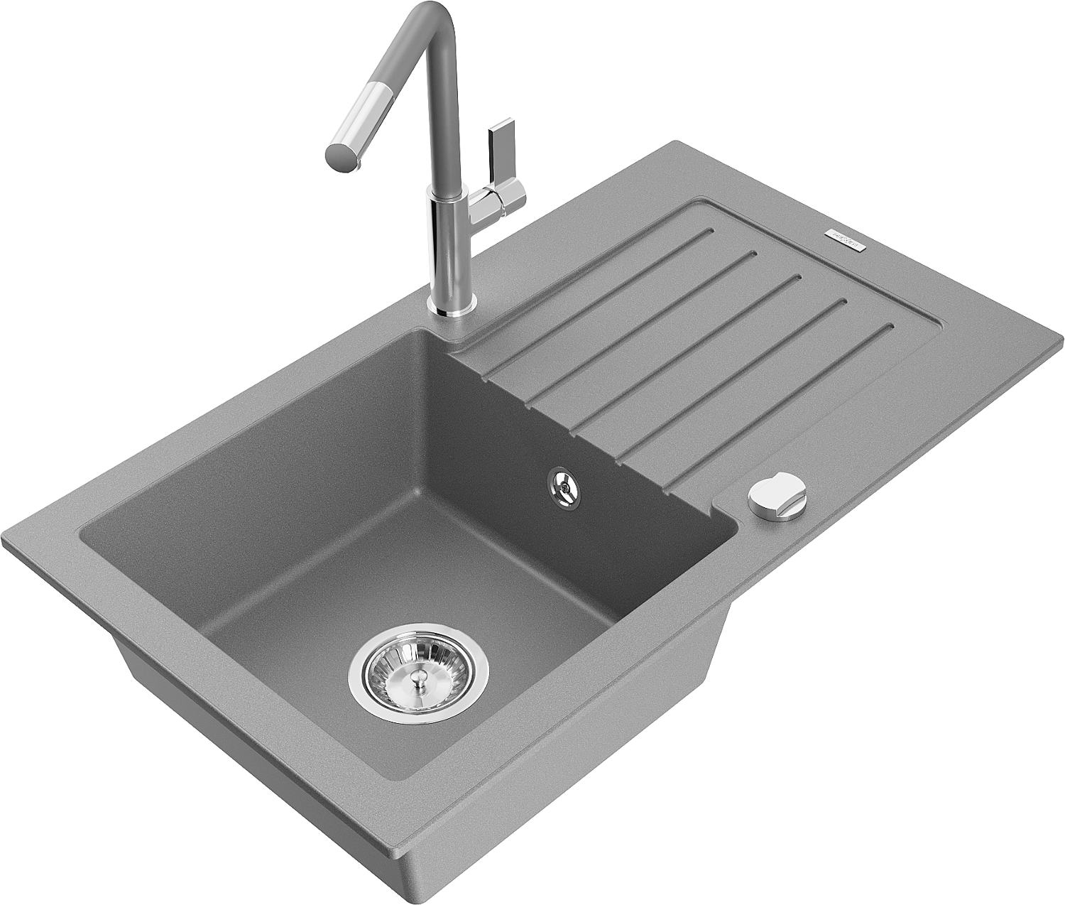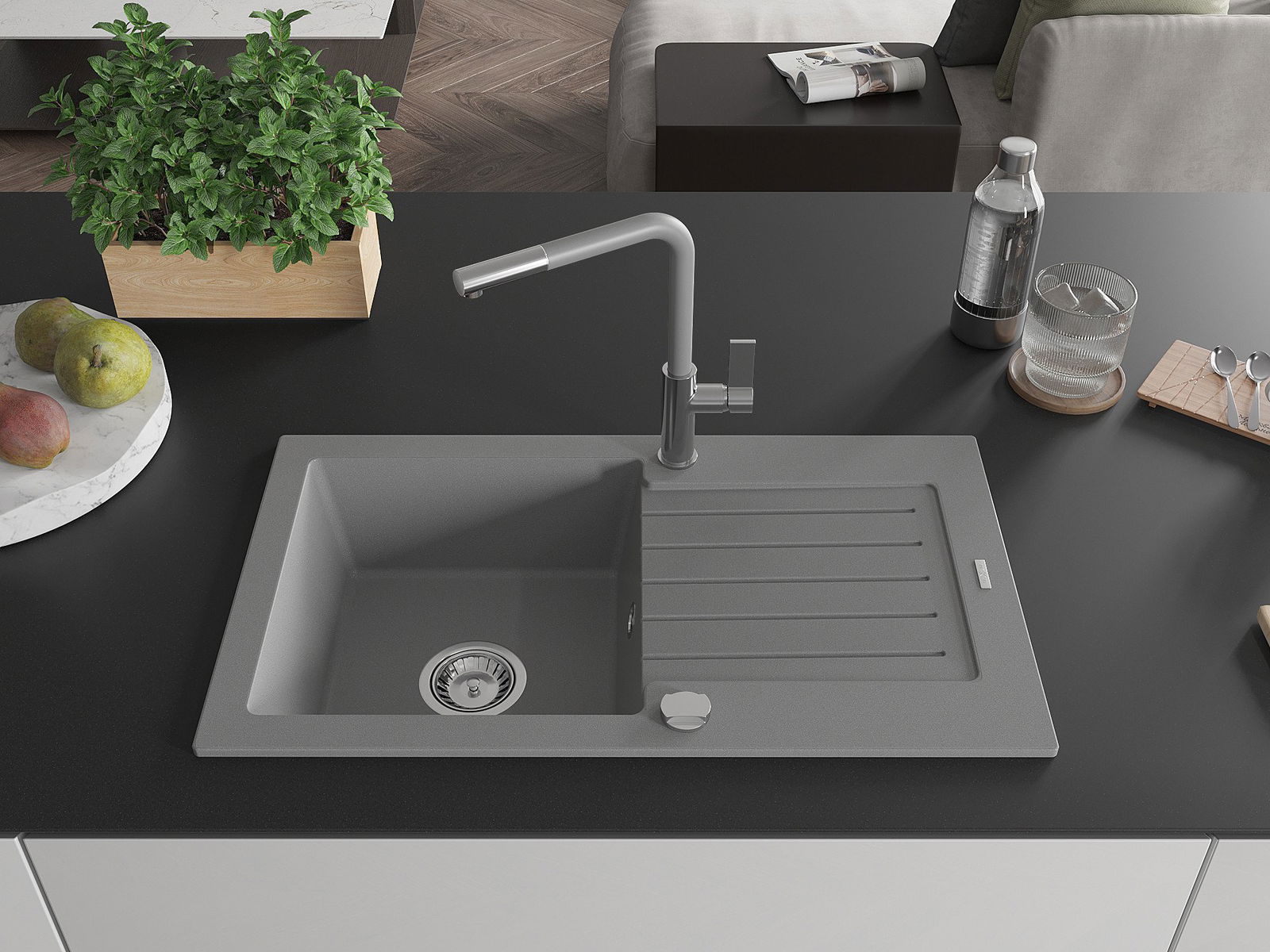 Mexen Pablo évier en granit à 1 bac avec égouttoir et mitigeur de cuisine Flora, gris - 6510-71-670401-06