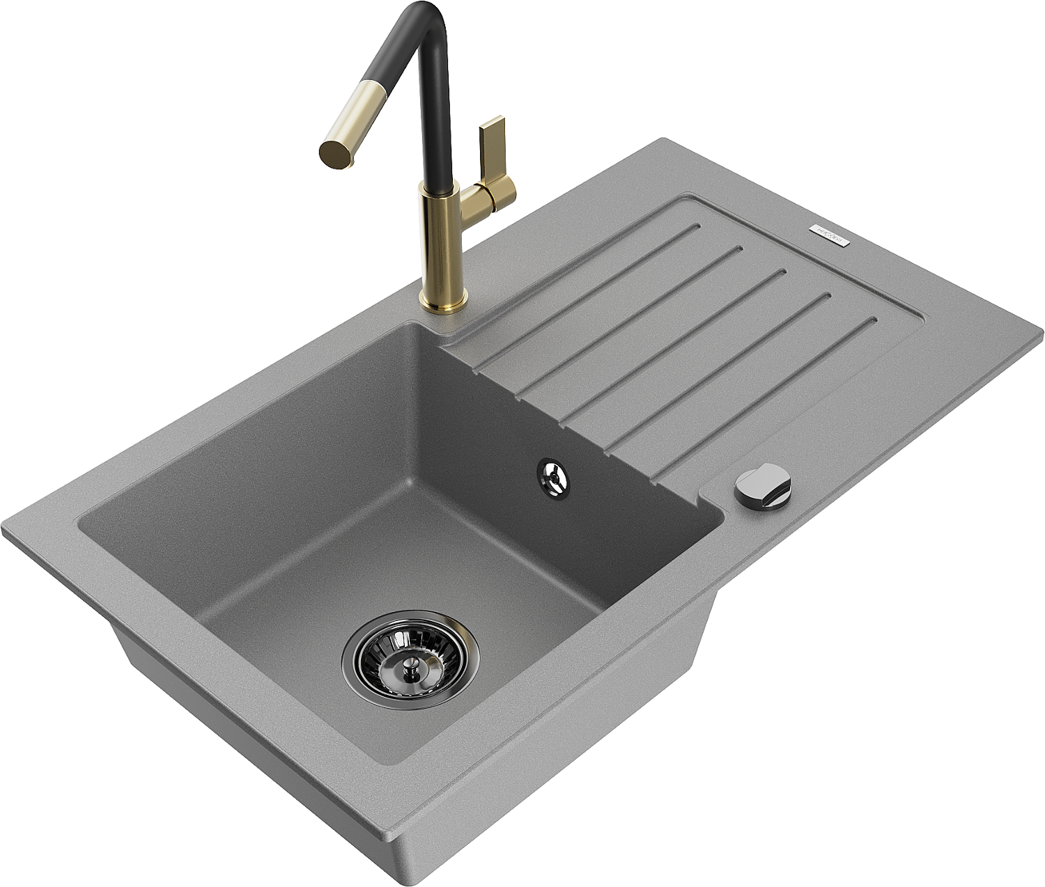 Mexen Pablo évier en granit à 1 bac avec égouttoir et robinet de cuisine Flora, gris - 6510-71-670401-57-B