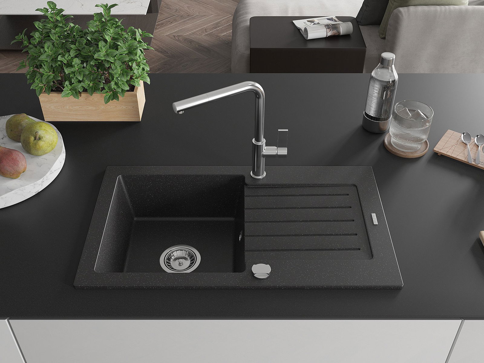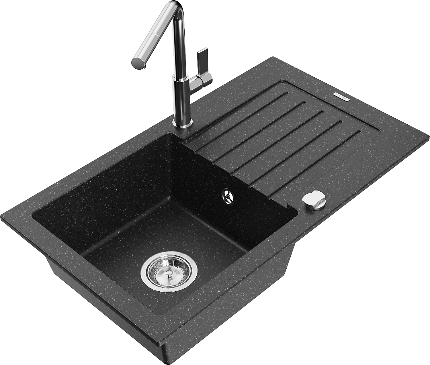Mexen Pablo évier en granit 1 bac avec égouttoir et robinet de cuisine Flora, noir/argent métallisé - 6510-73-670401-00
