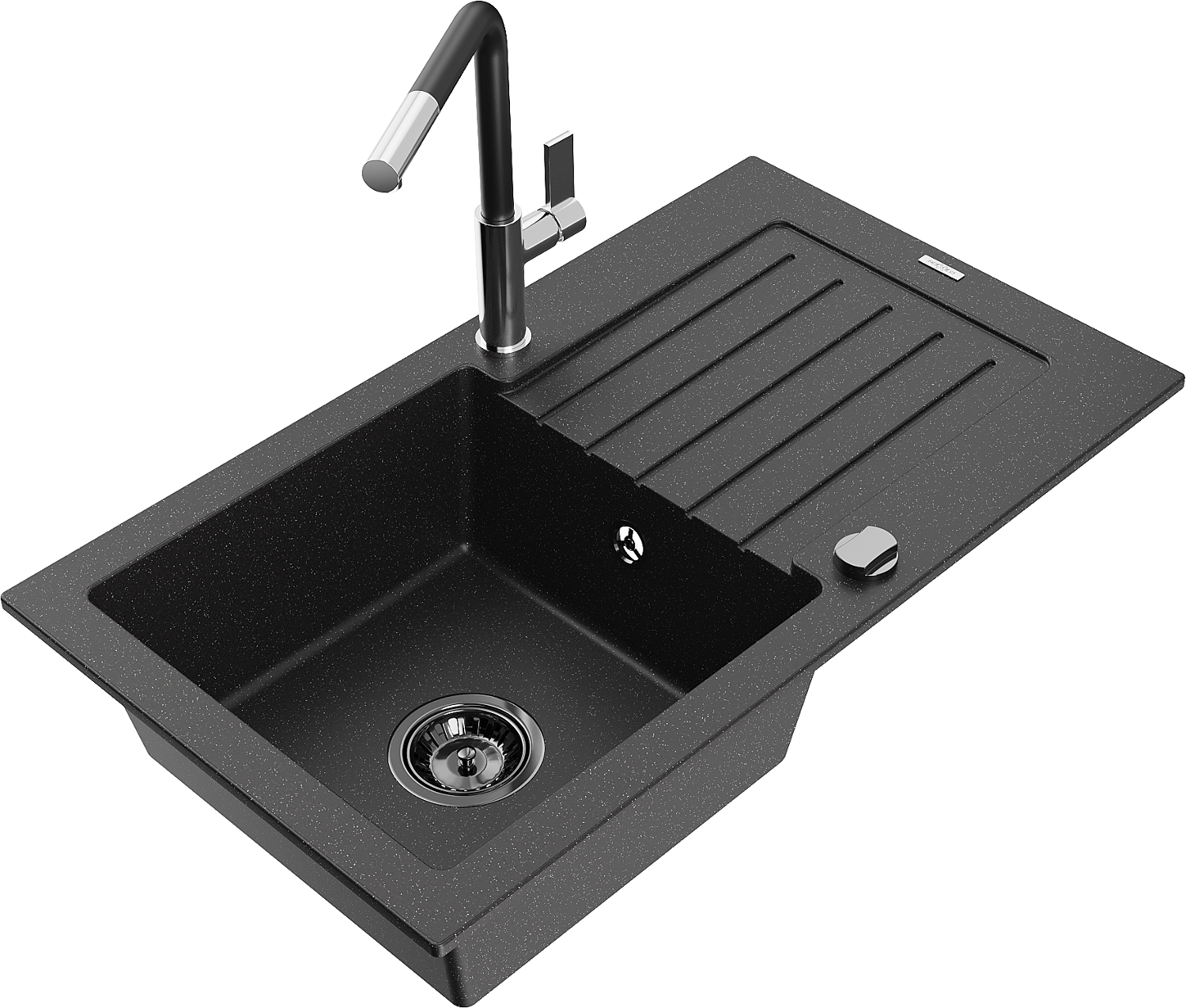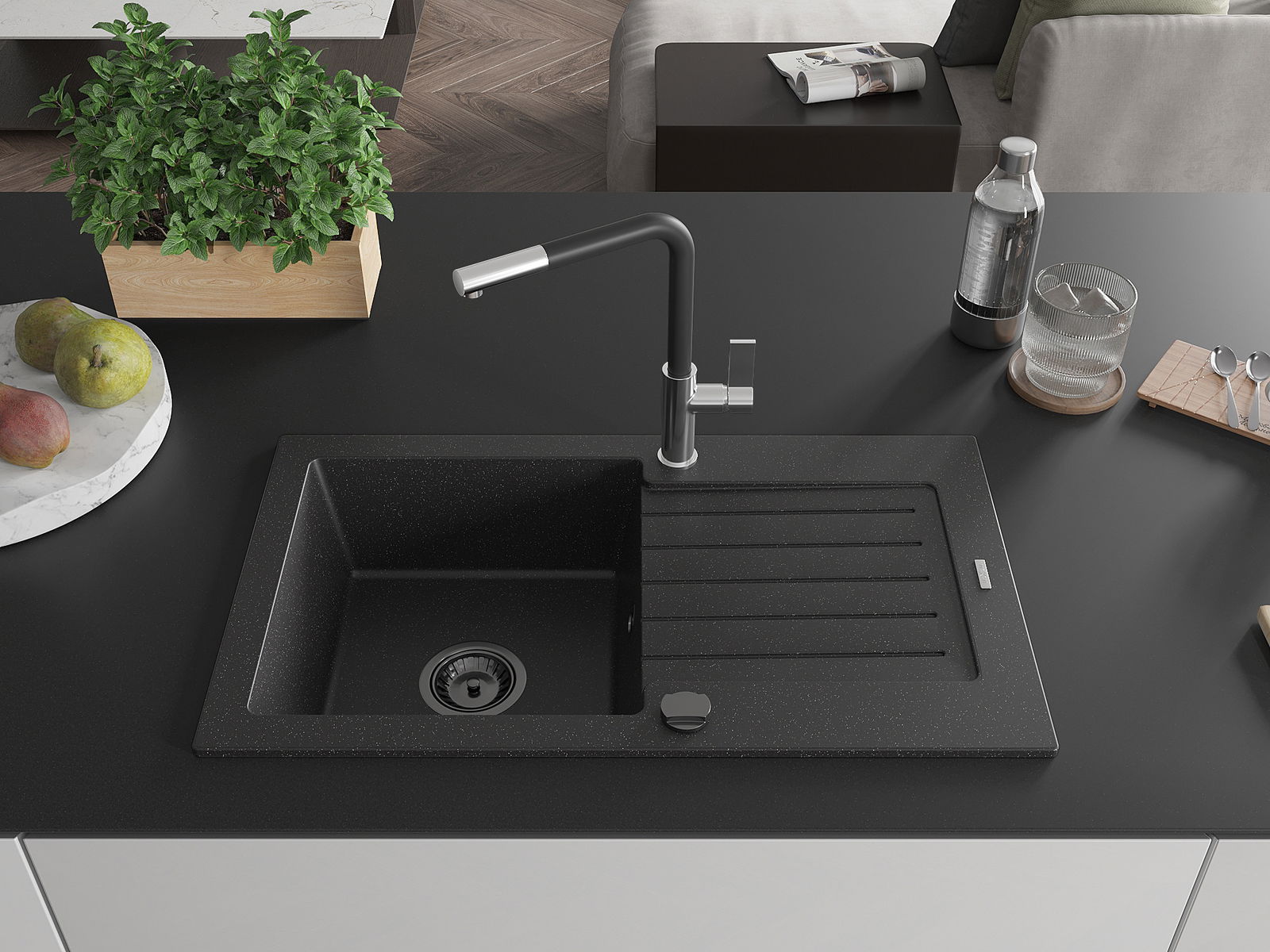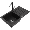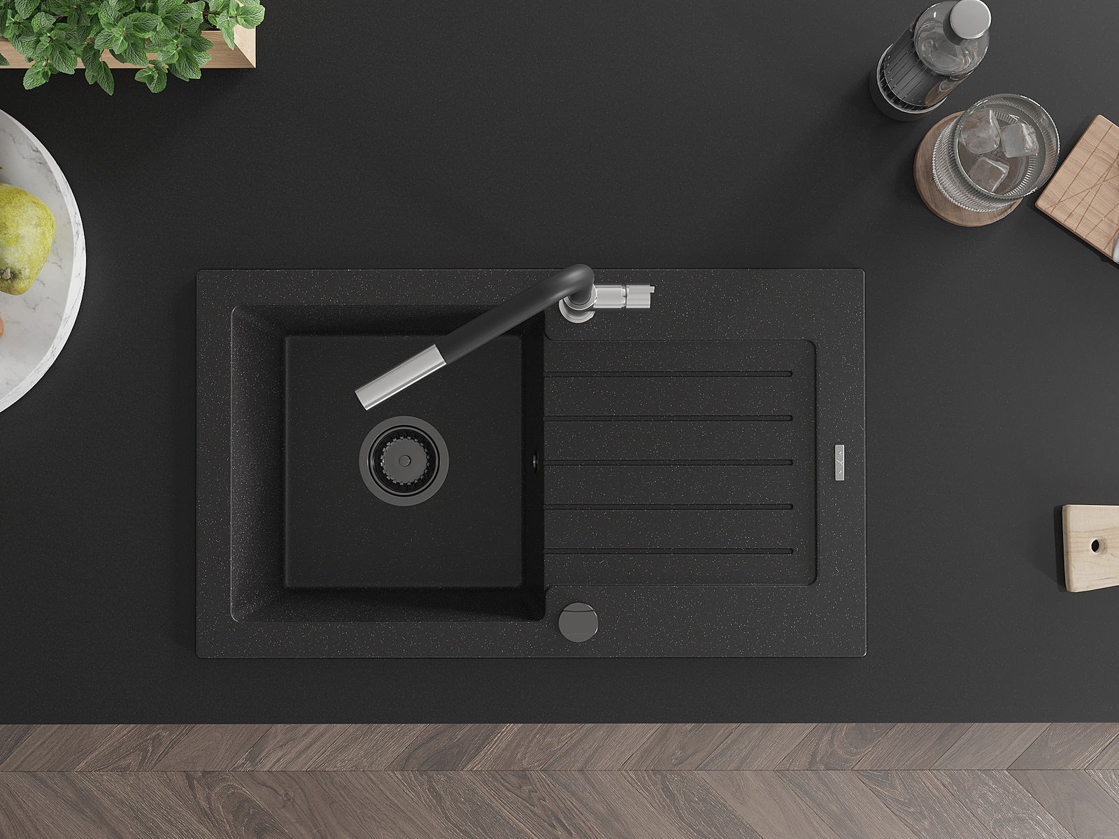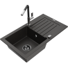 Mexen Pablo évier en granit 1 bac avec égouttoir et robinet de cuisine Flora, noir/argent métallisé - 6510-73-670401-07-B