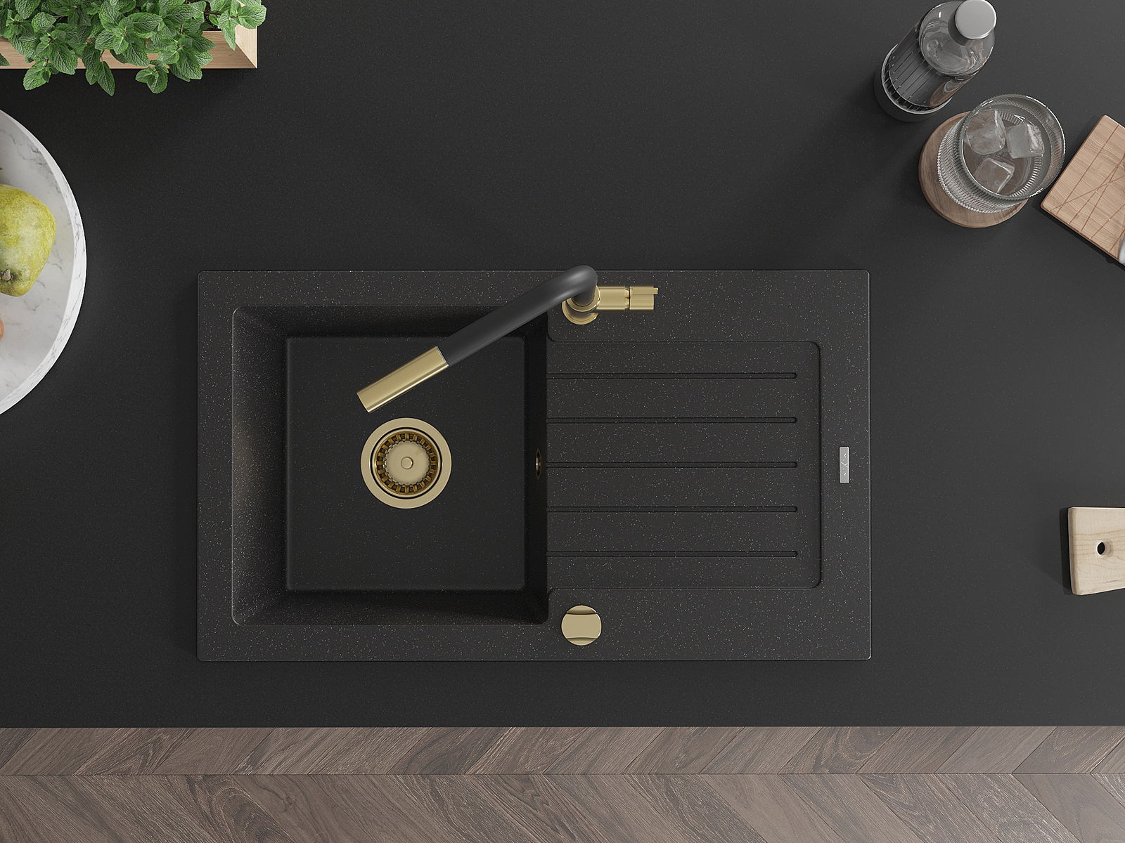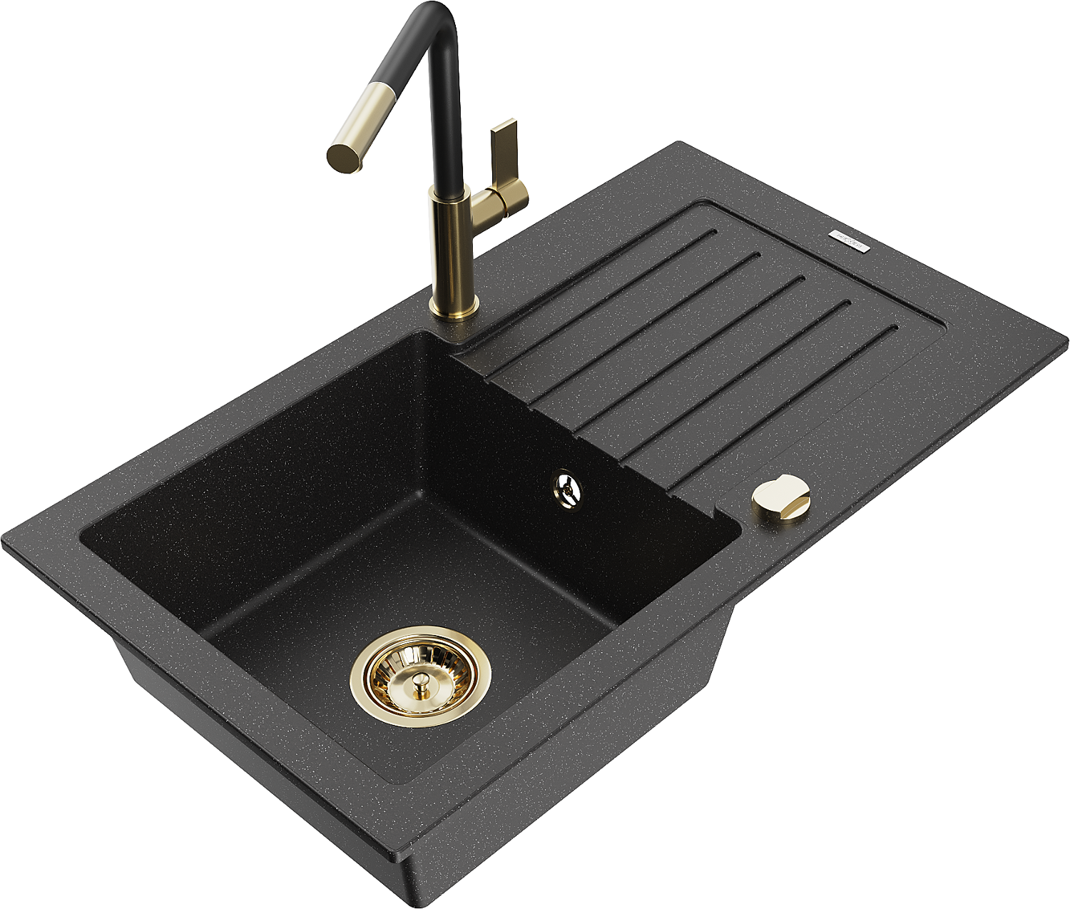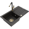 Mexen Pablo évier en granit 1 bac avec égouttoir et robinet de cuisine Flora, noir/argent métallique - 6510-73-670401-57-G