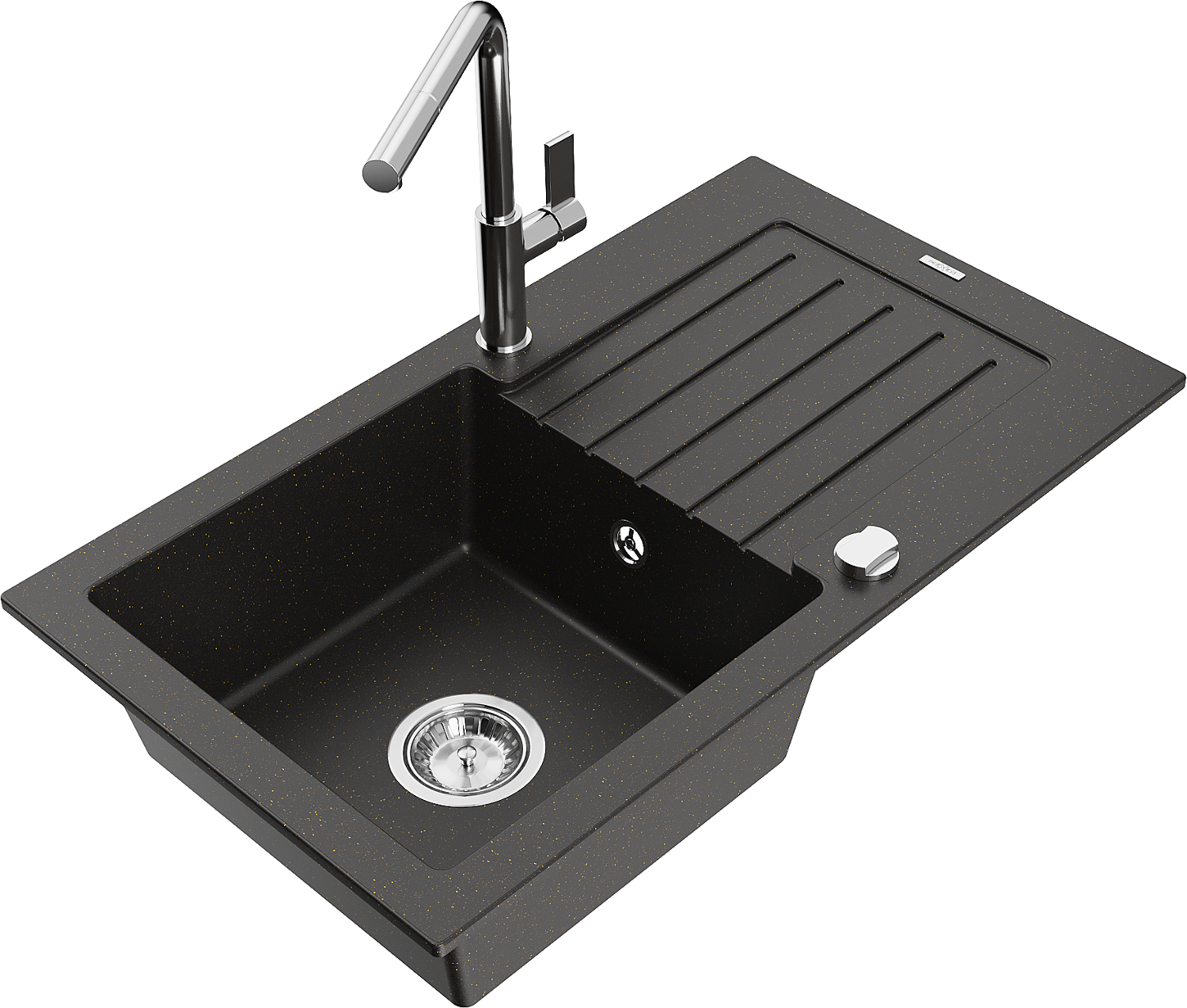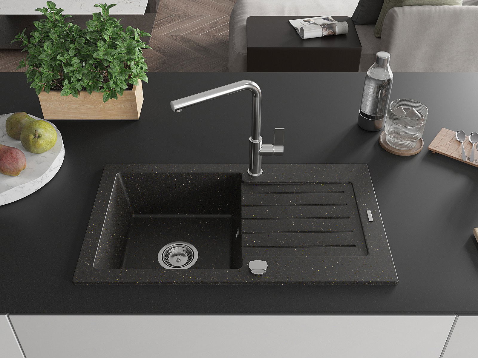 Mexen Pablo évier en granit 1 bac avec égouttoir et robinet de cuisine Flora, noir/or métallique - 6510-75-670401-00