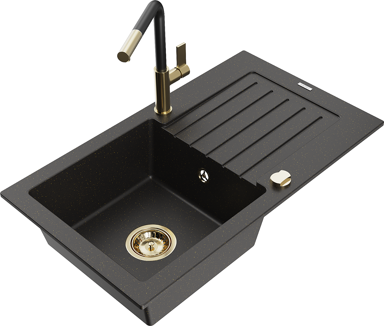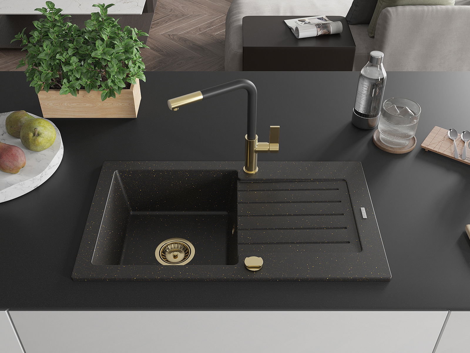 Mexen Pablo évier en granit 1 bac avec égouttoir et robinet de cuisine Flora, noir/or métallique - 6510-75-670401-57-G