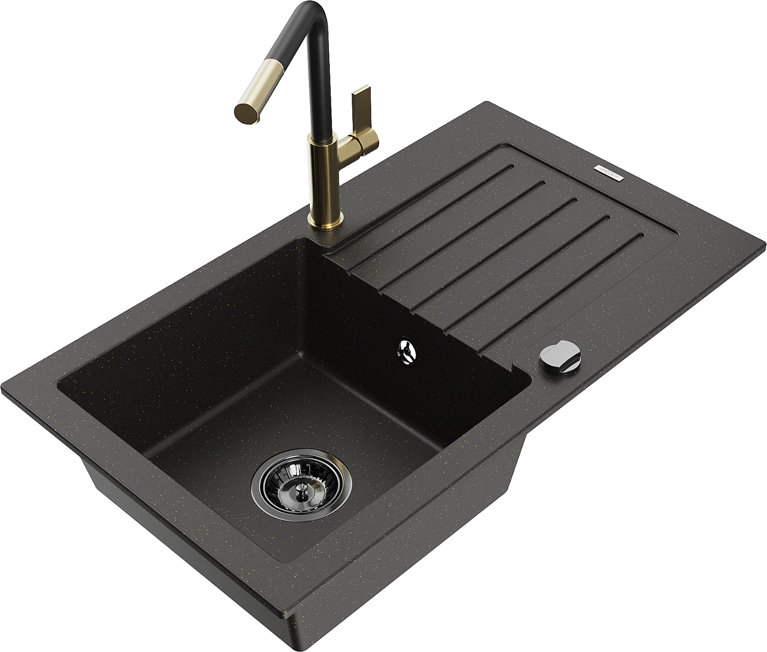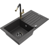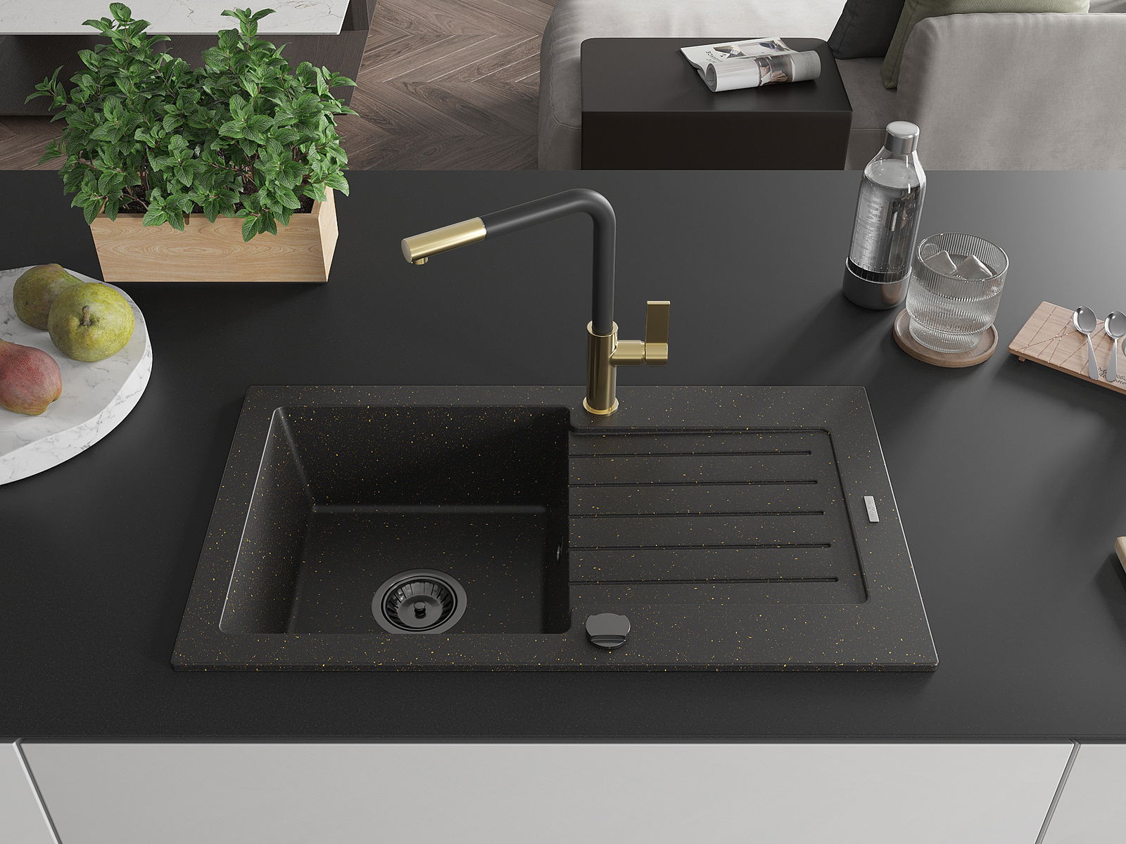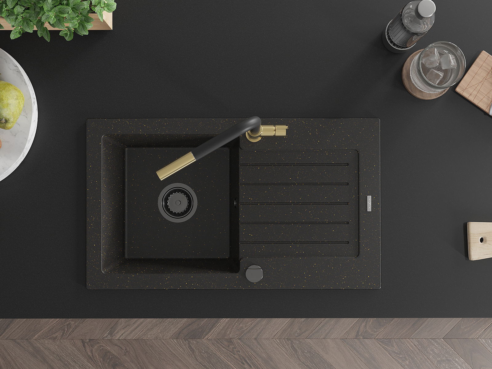 Mexen Pablo évier en granit à 1 bac avec égouttoir et robinet de cuisine Flora, noir/métallique doré - 6510-75-670401-57-B