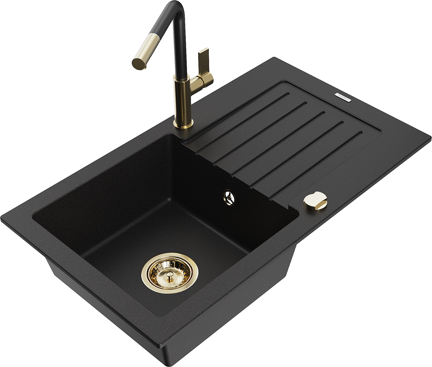 Mexen Pablo évier de cuisine en granit à 1 bac avec égouttoir et robinet de cuisine Flora, noir - 6510-77-670401-57-G
