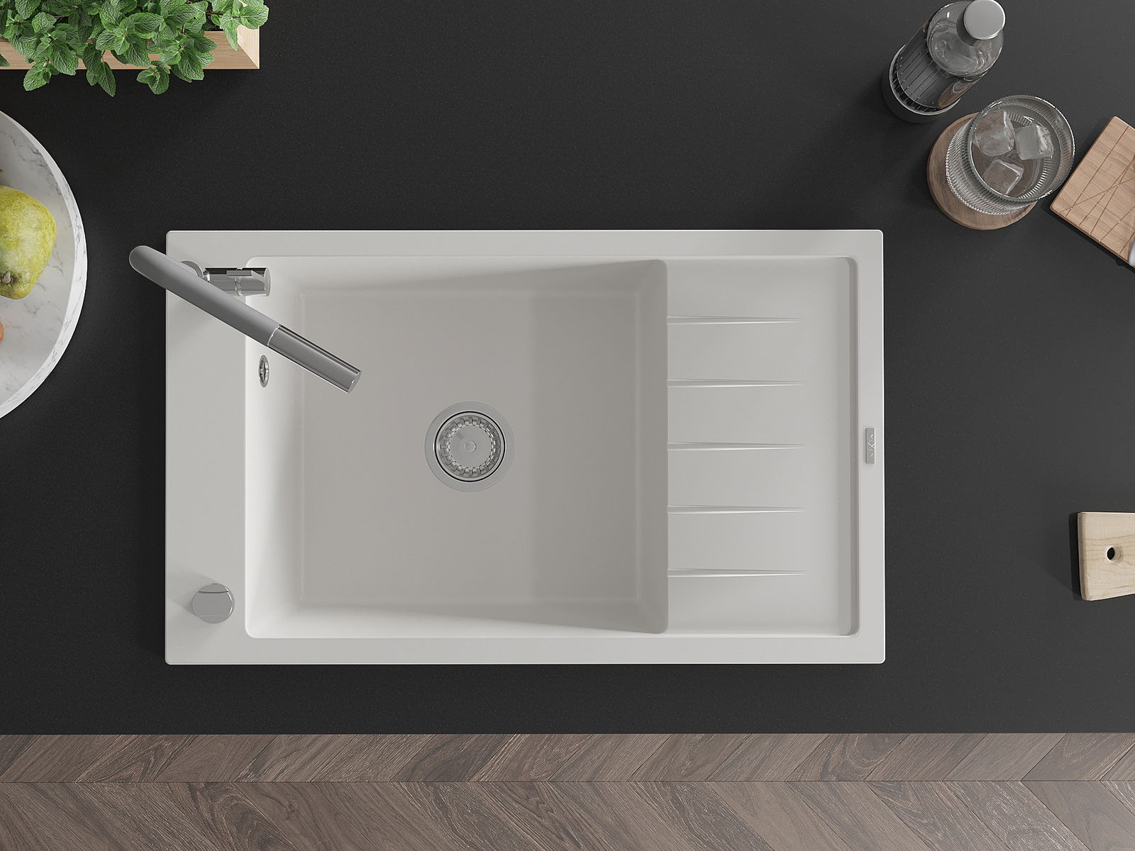 Mexen Elias évier de cuisine en granit 1 bac avec égouttoir et robinet de cuisine Flora, blanc - 6511-20-670401-06