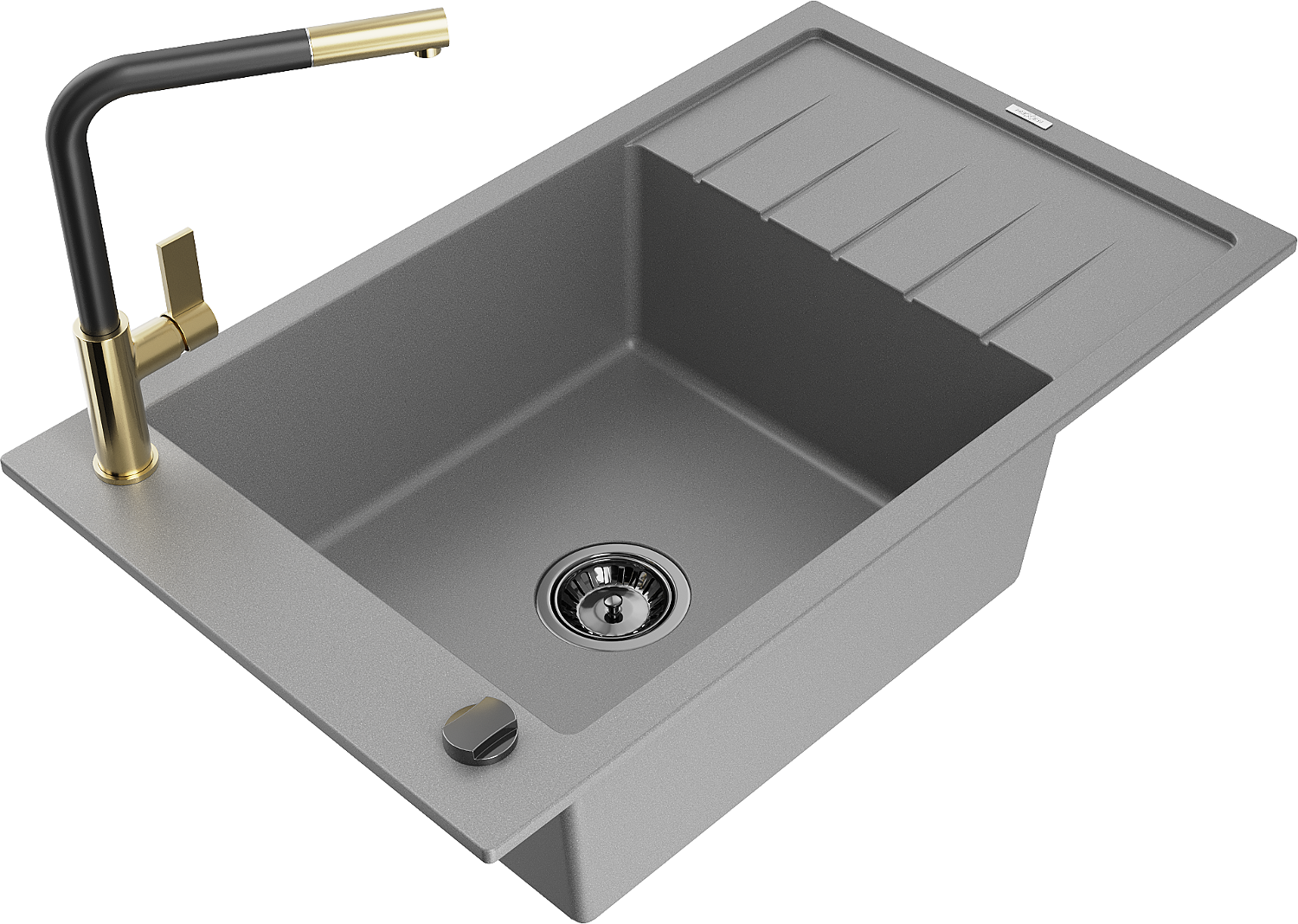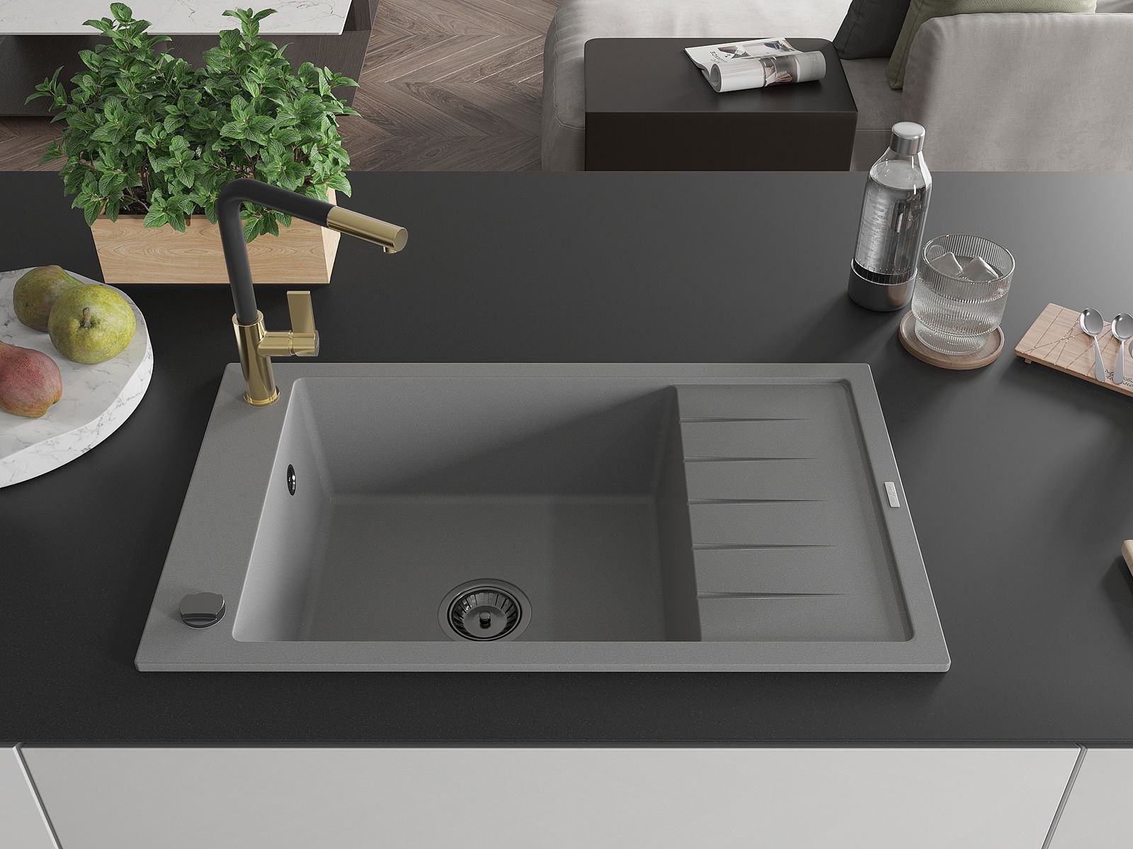 Mexen Elias évier en granit 1 bac avec égouttoir et robinet de cuisine Flora, gris - 6511-71-670401-57-B