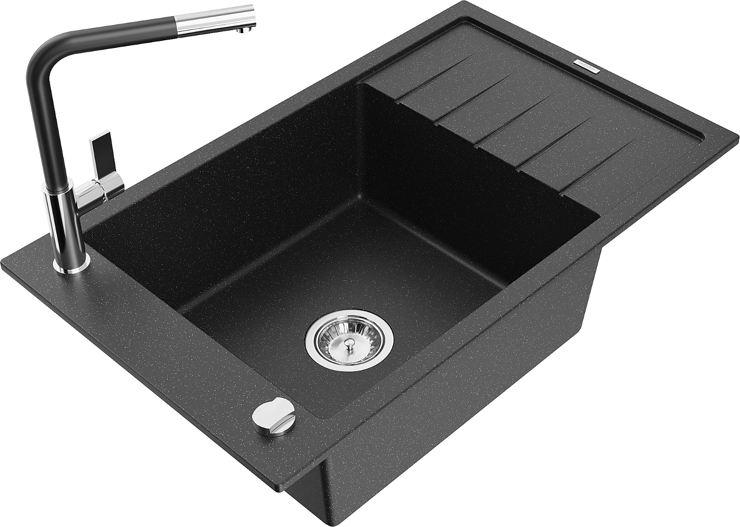 Mexen Elias évier en granit 1 bac avec égouttoir et robinet de cuisine Flora, noir/métallisé argent - 6511-73-670401-07