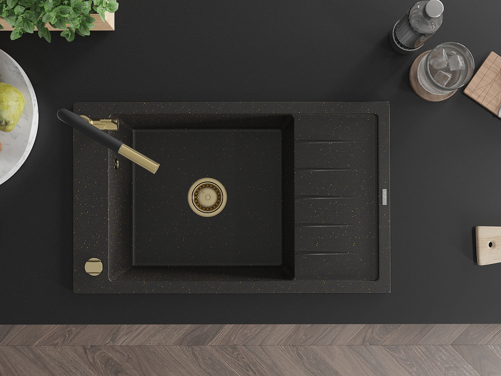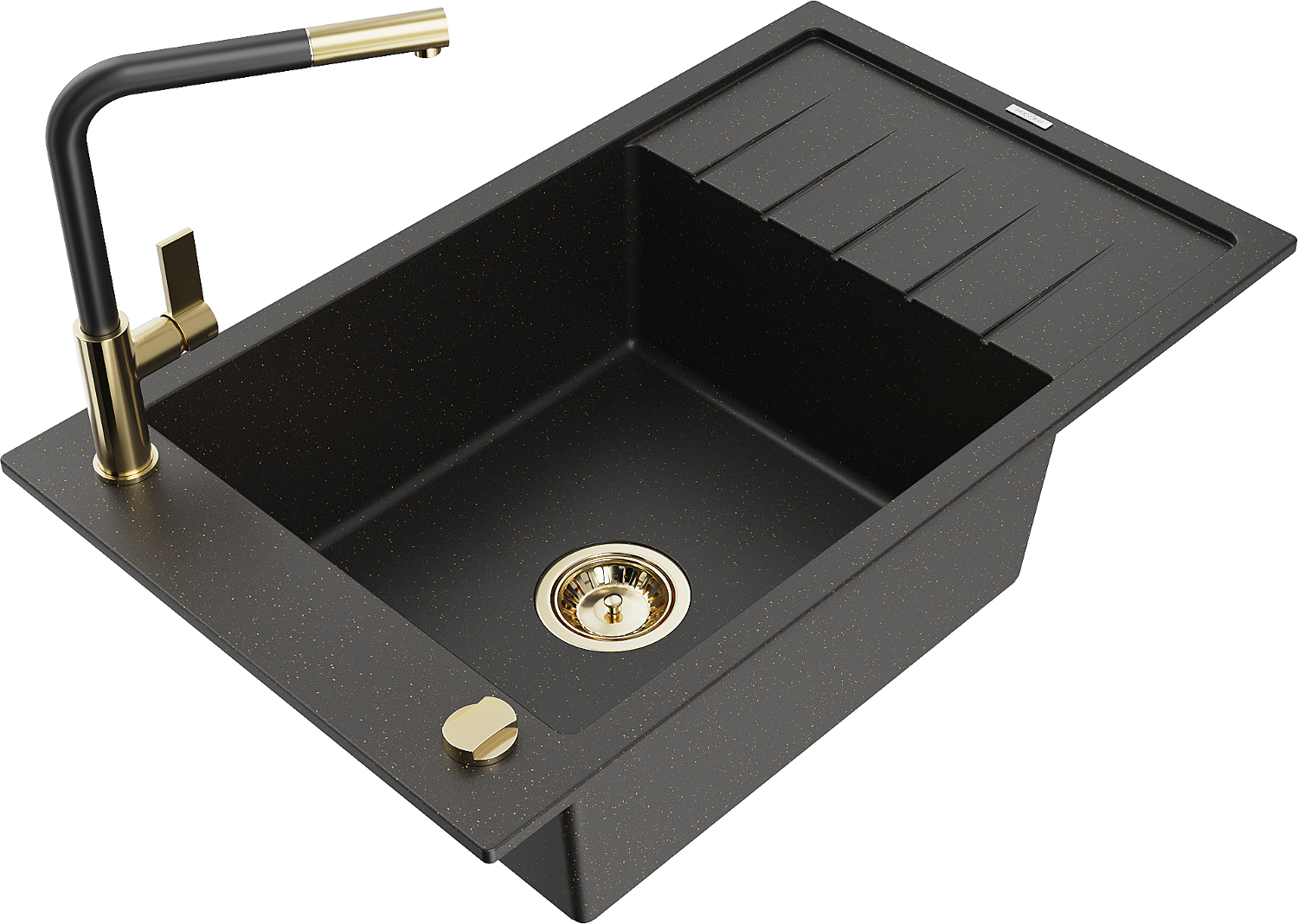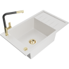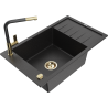 Mexen Elias évier en granit à 1 bac avec égouttoir et robinet de cuisine Flora, noir/métallique doré - 6511-75-670401-57-G