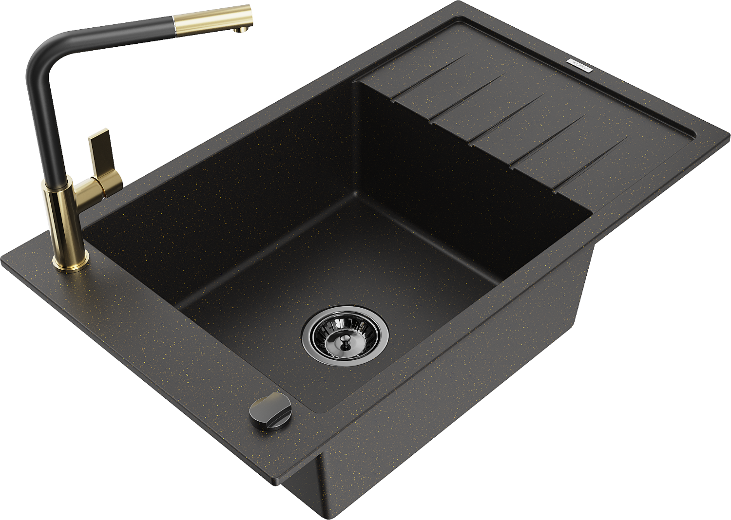 Mexen Elias évier en granit 1 bac avec égouttoir et robinet de cuisine Flora, noir/or métallique - 6511-75-670401-57-B