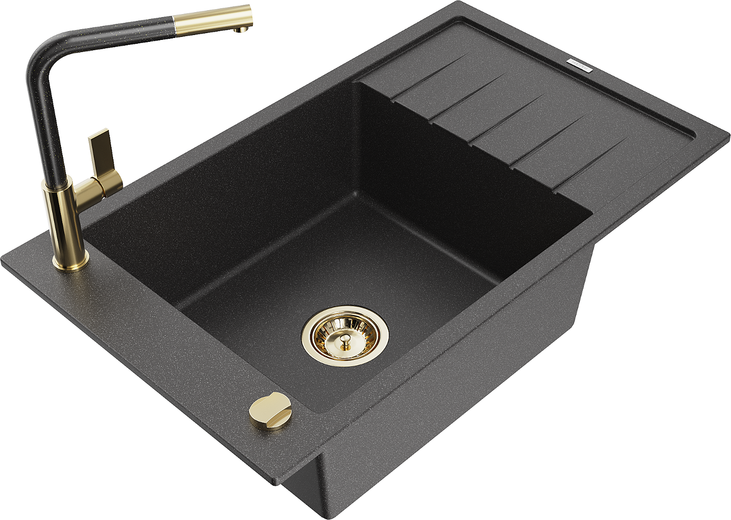 Mexen Elias évier en granit 1 bac avec égouttoir et mitigeur de cuisine Flora, noir moucheté - 6511-76-670401-75-G