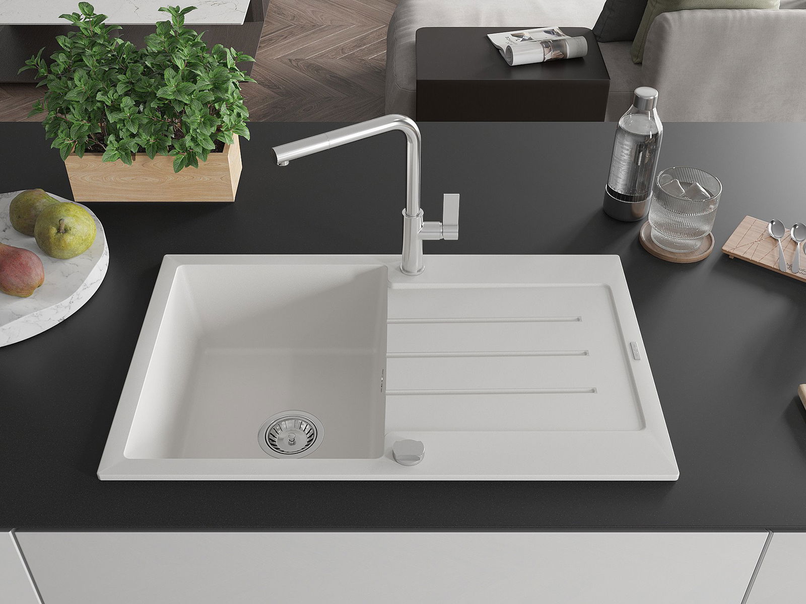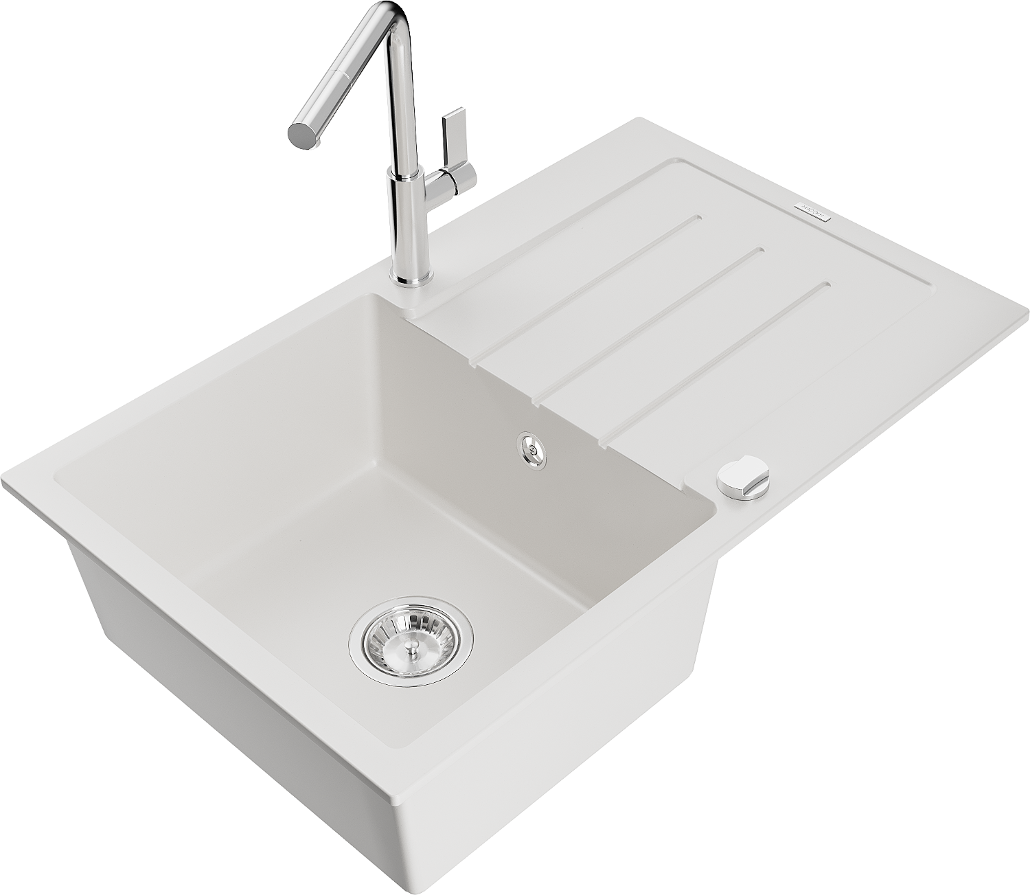 Mexen Bruno évier en granit 1 bac avec égouttoir et mitigeur de cuisine Flora, blanc - 6513-20-670401-00