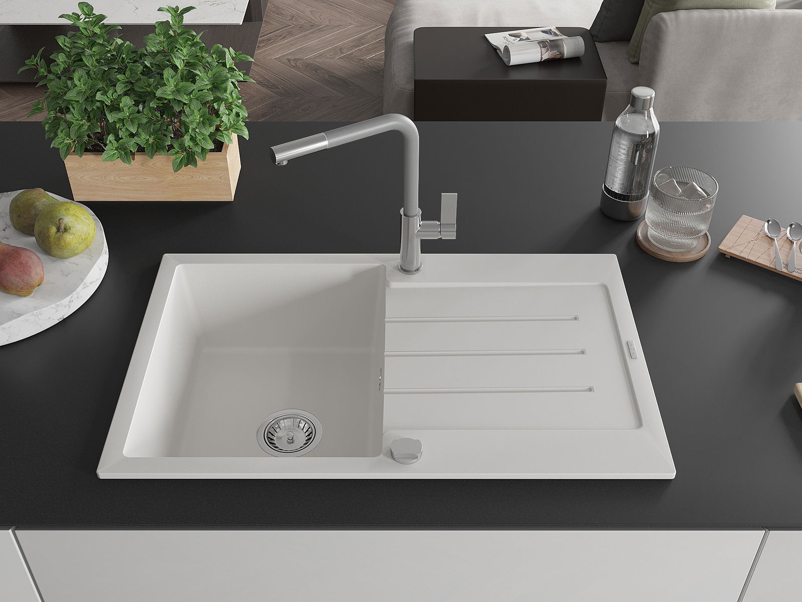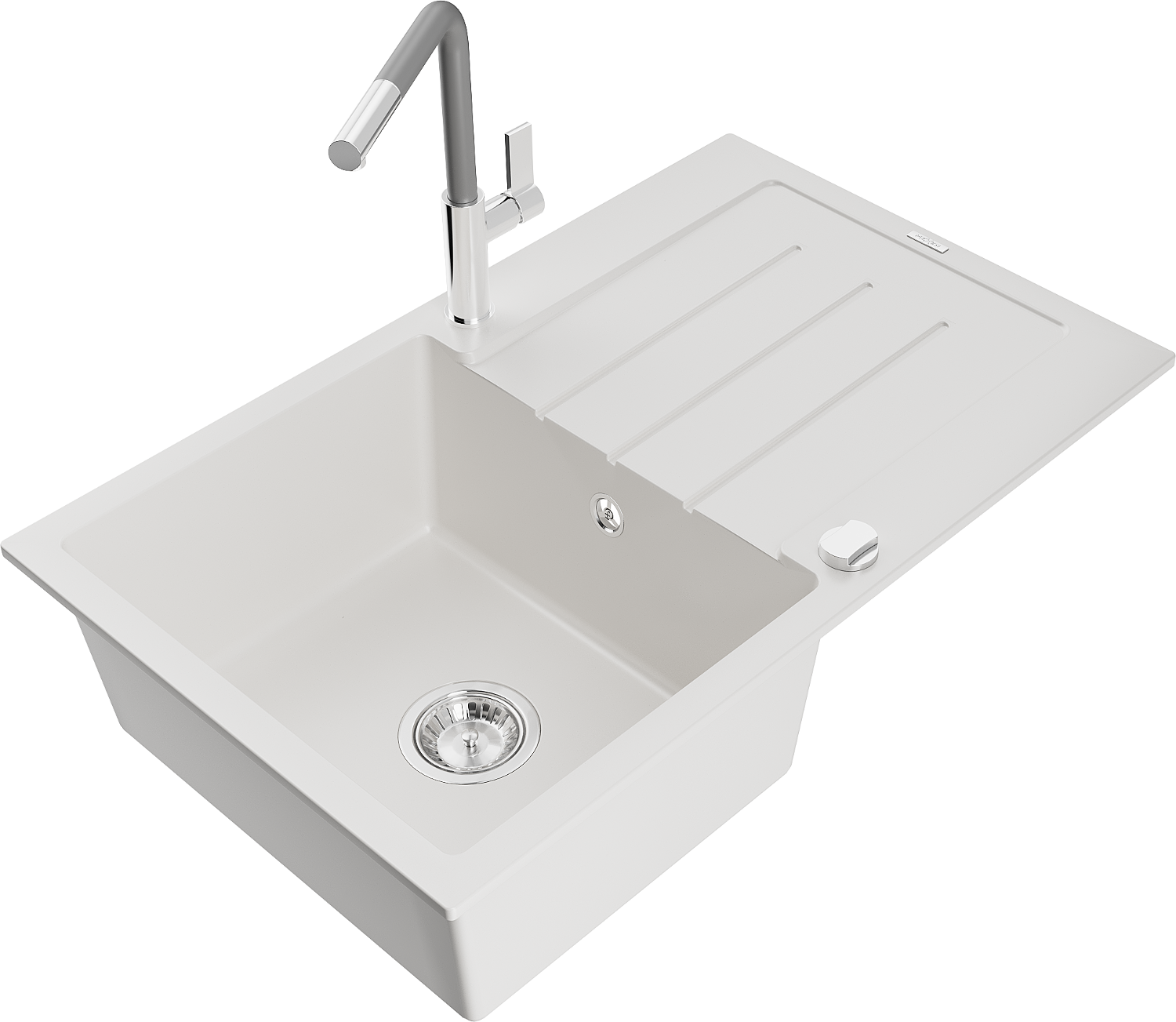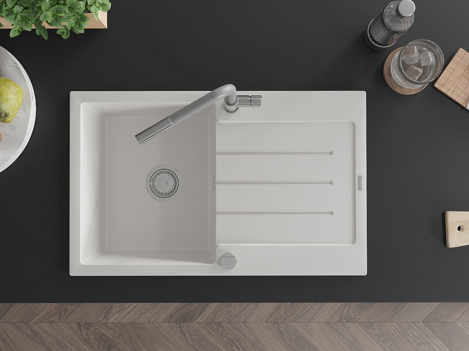 Mexen Bruno évier en granit 1 bac avec égouttoir et robinet de cuisine Flora, blanc - 6513-20-670401-06