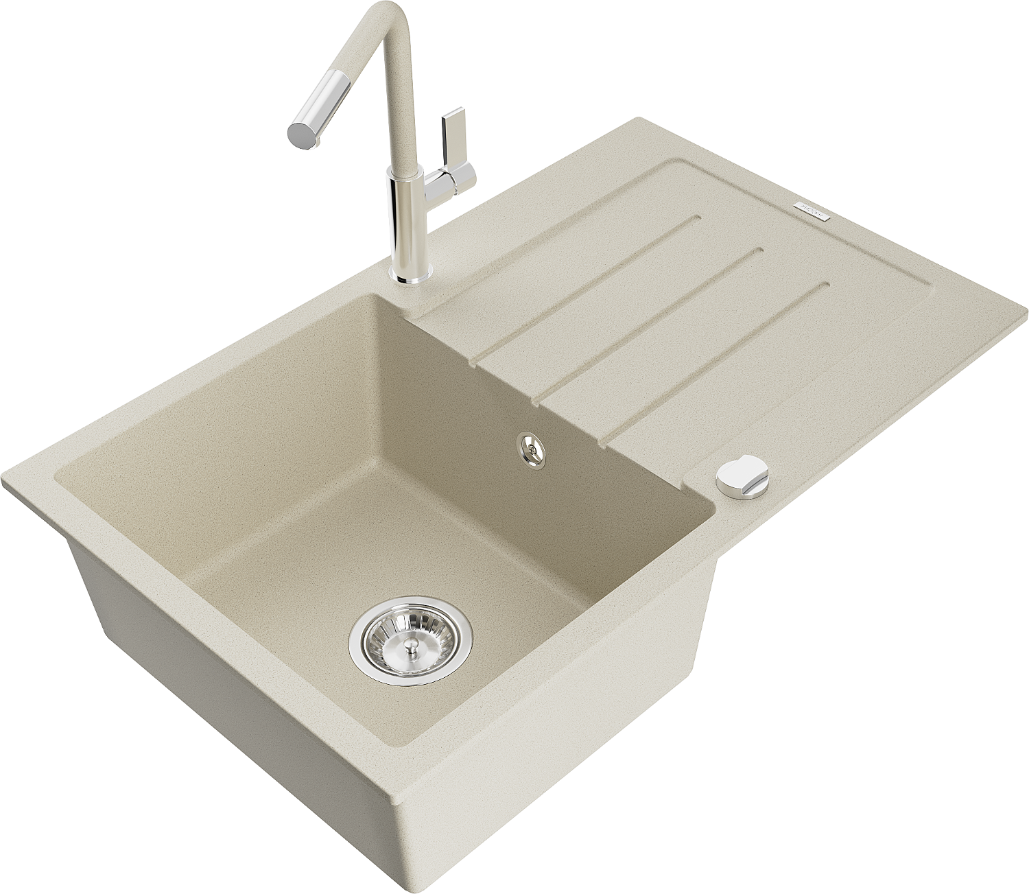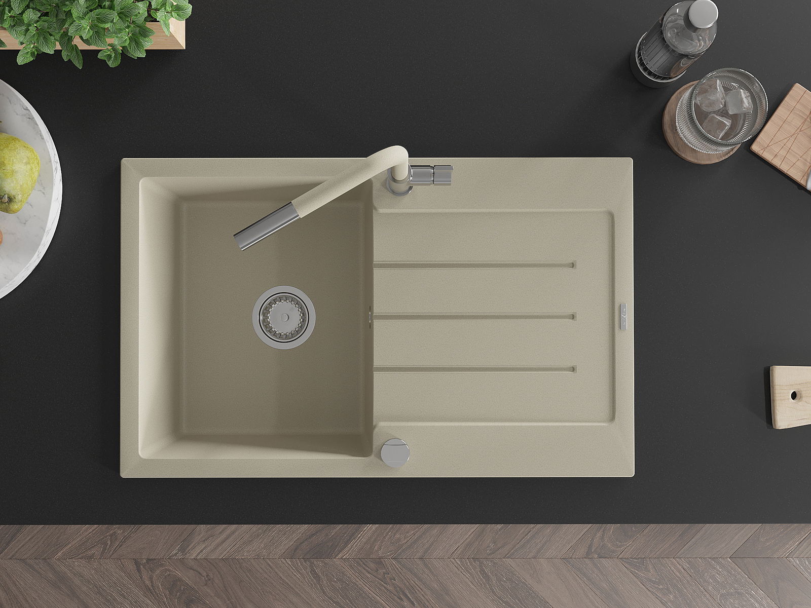 Mexen Bruno évier en granit 1 bac avec égouttoir et robinet de cuisine Flora, beige - 6513-69-670401-09