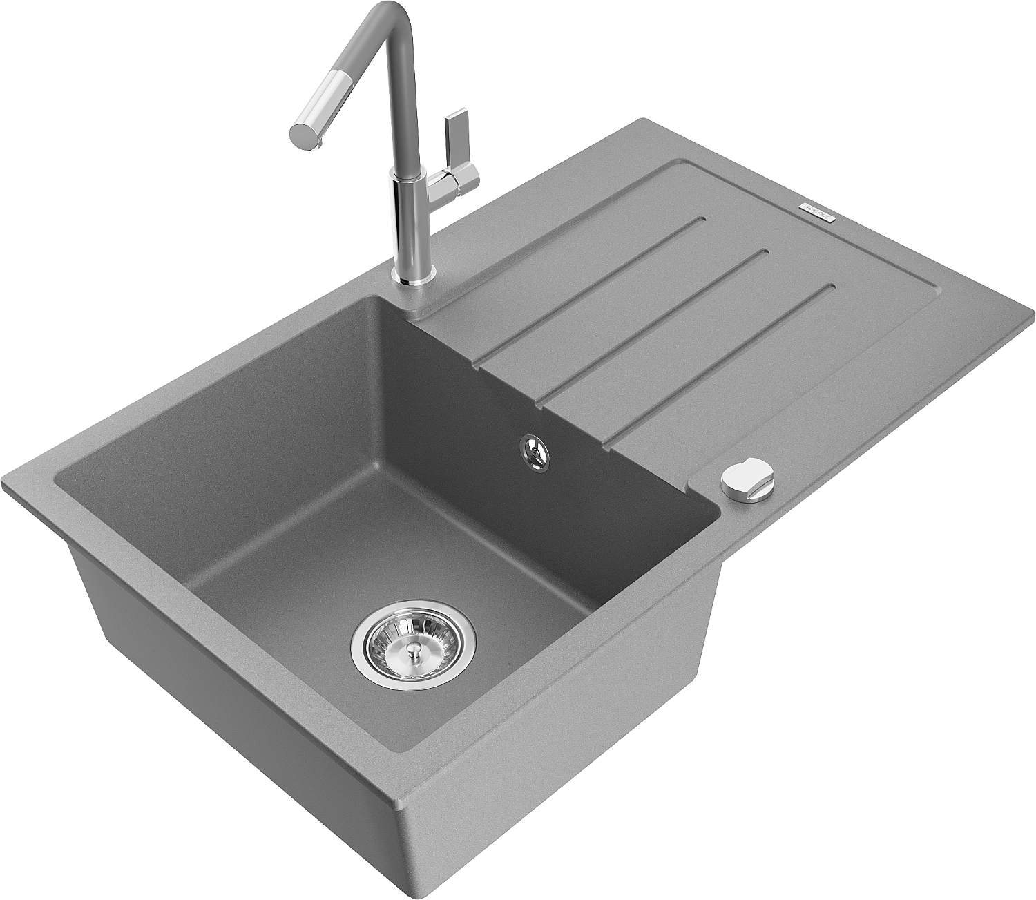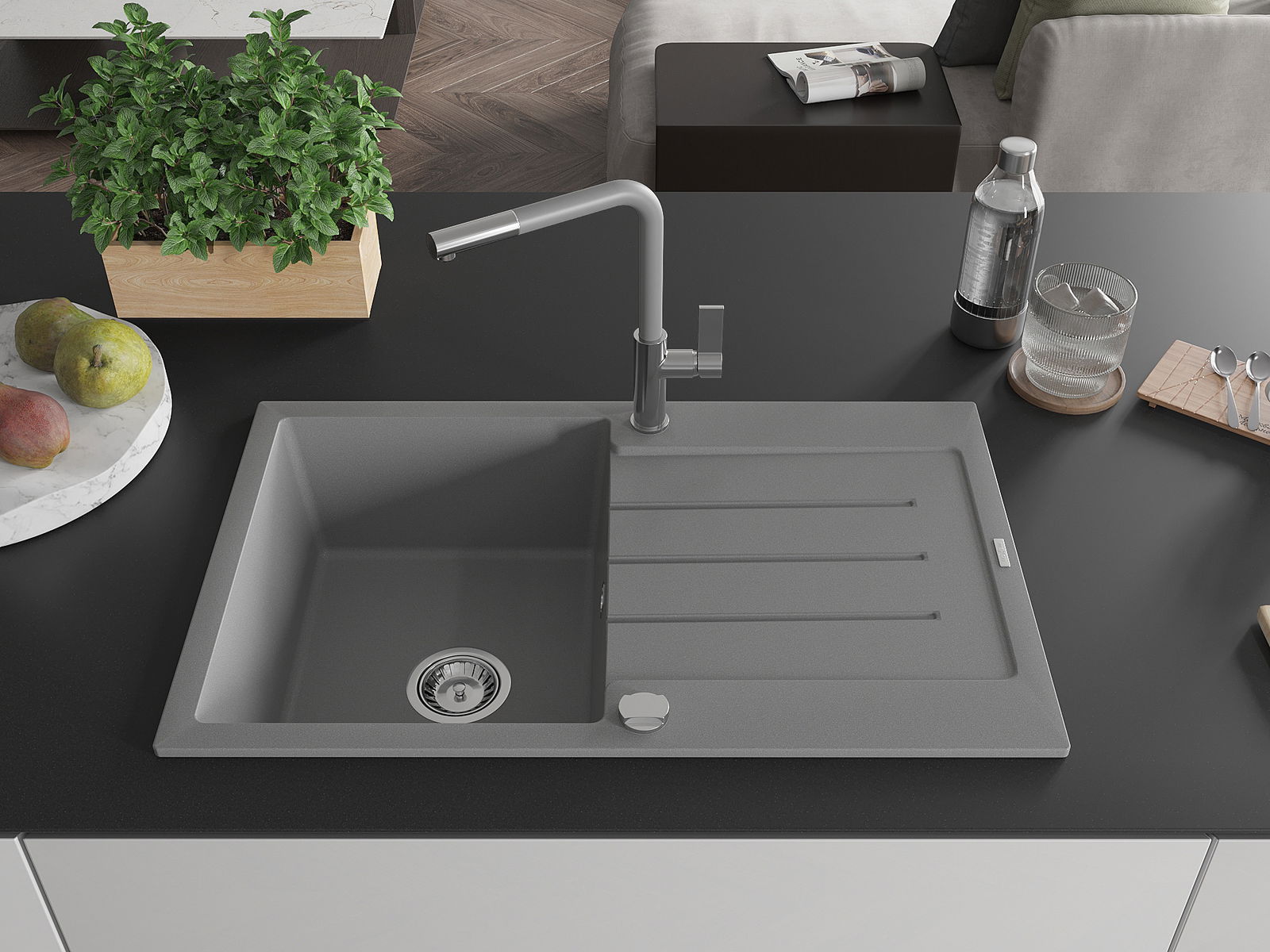 Mexen Bruno évier de cuisine en granit 1 bac avec égouttoir et robinet de cuisine Flora, gris - 6513-71-670401-06