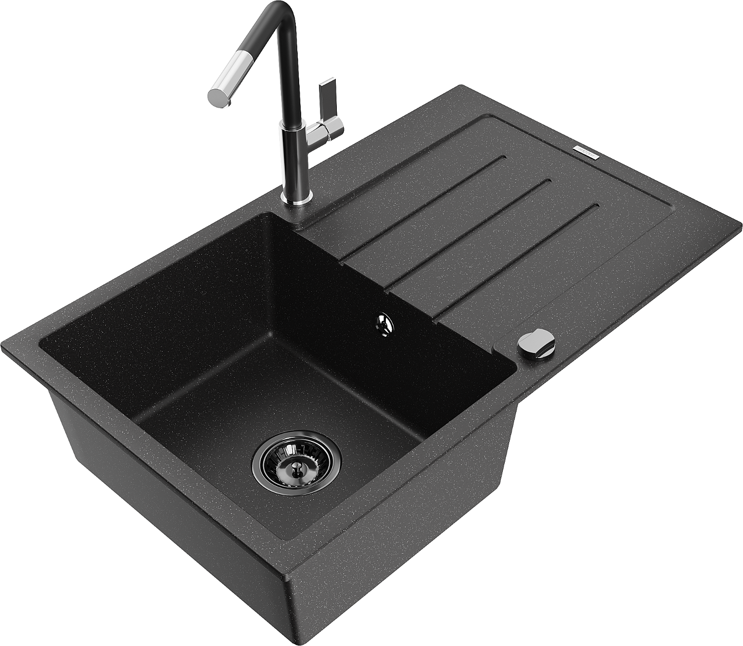 Mexen Bruno évier en granit 1-bac avec égouttoir et robinet de cuisine Flora, noir/argent métallique - 6513-73-670401-07-B