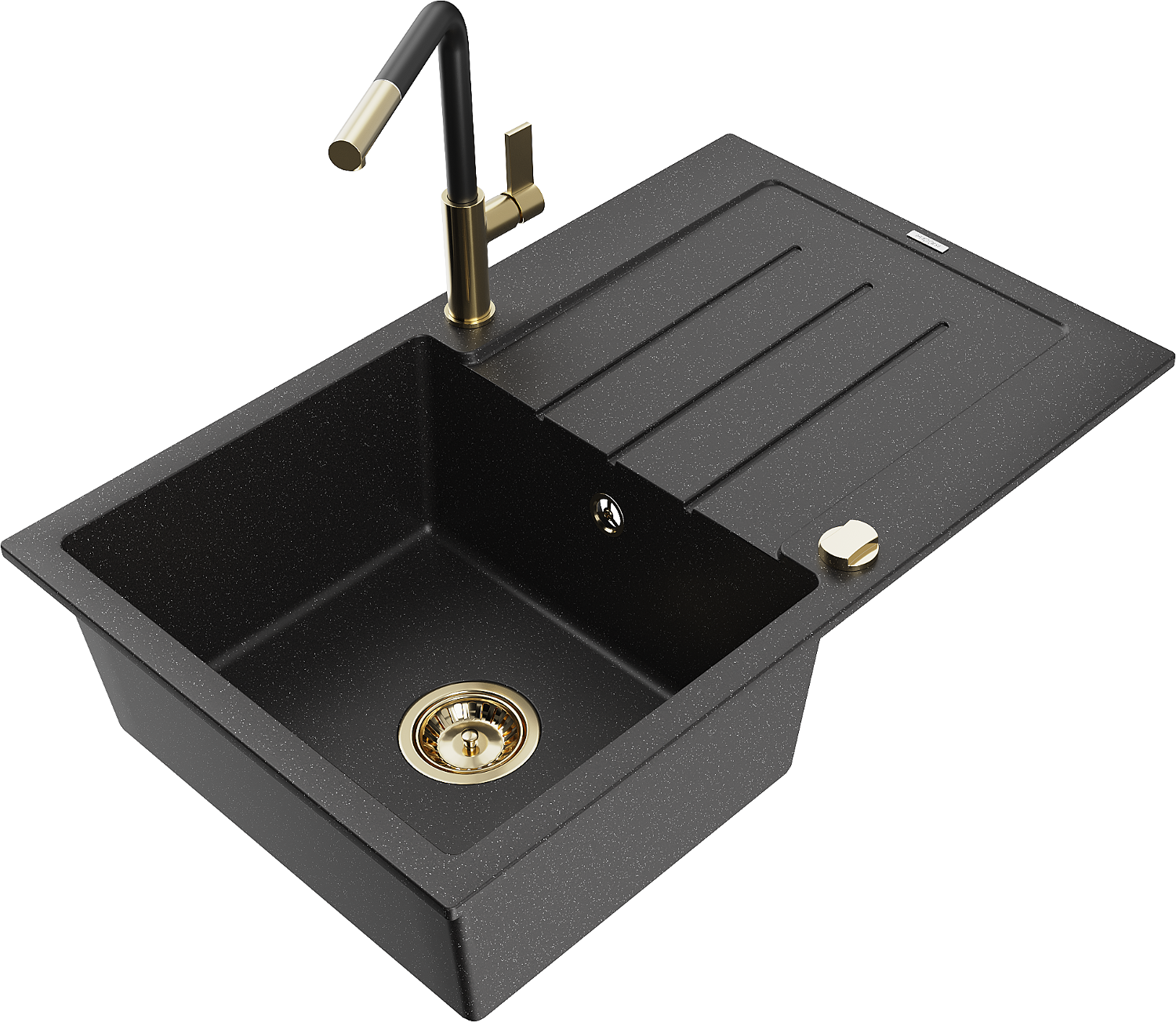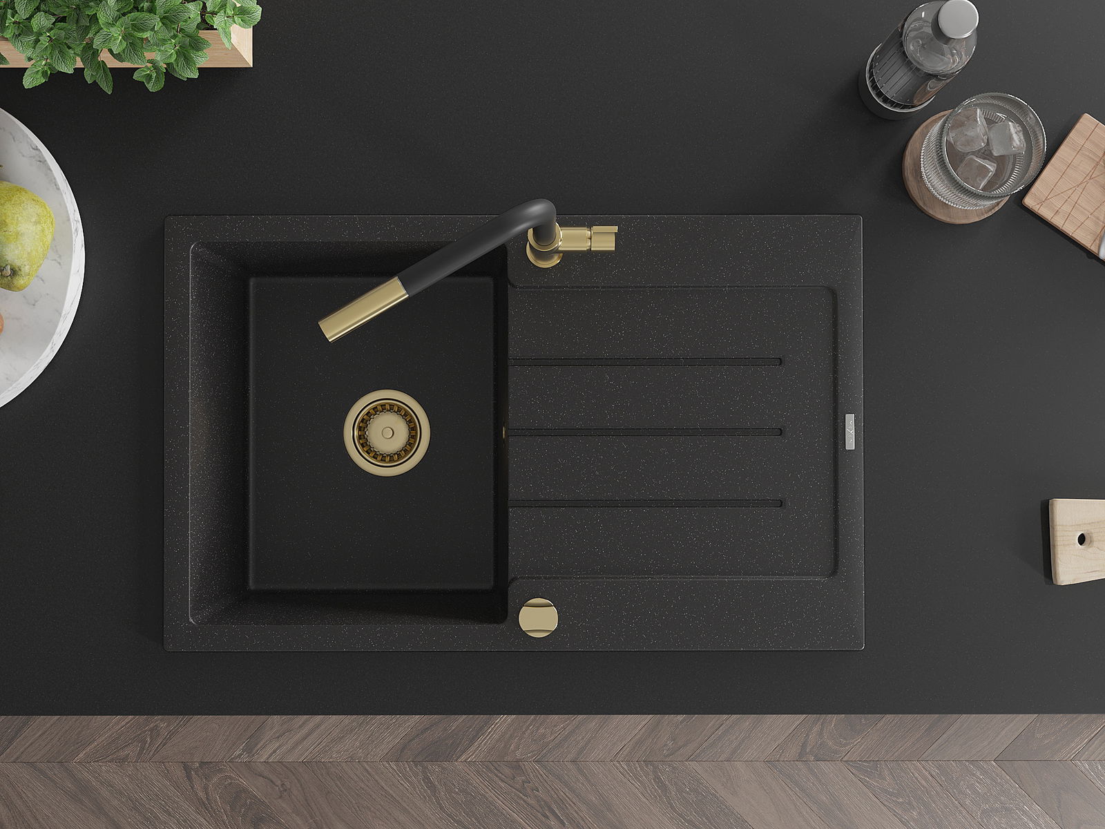 Mexen Bruno évier en granit à 1 bac avec égouttoir et robinet de cuisine Flora, noir/métallique argenté