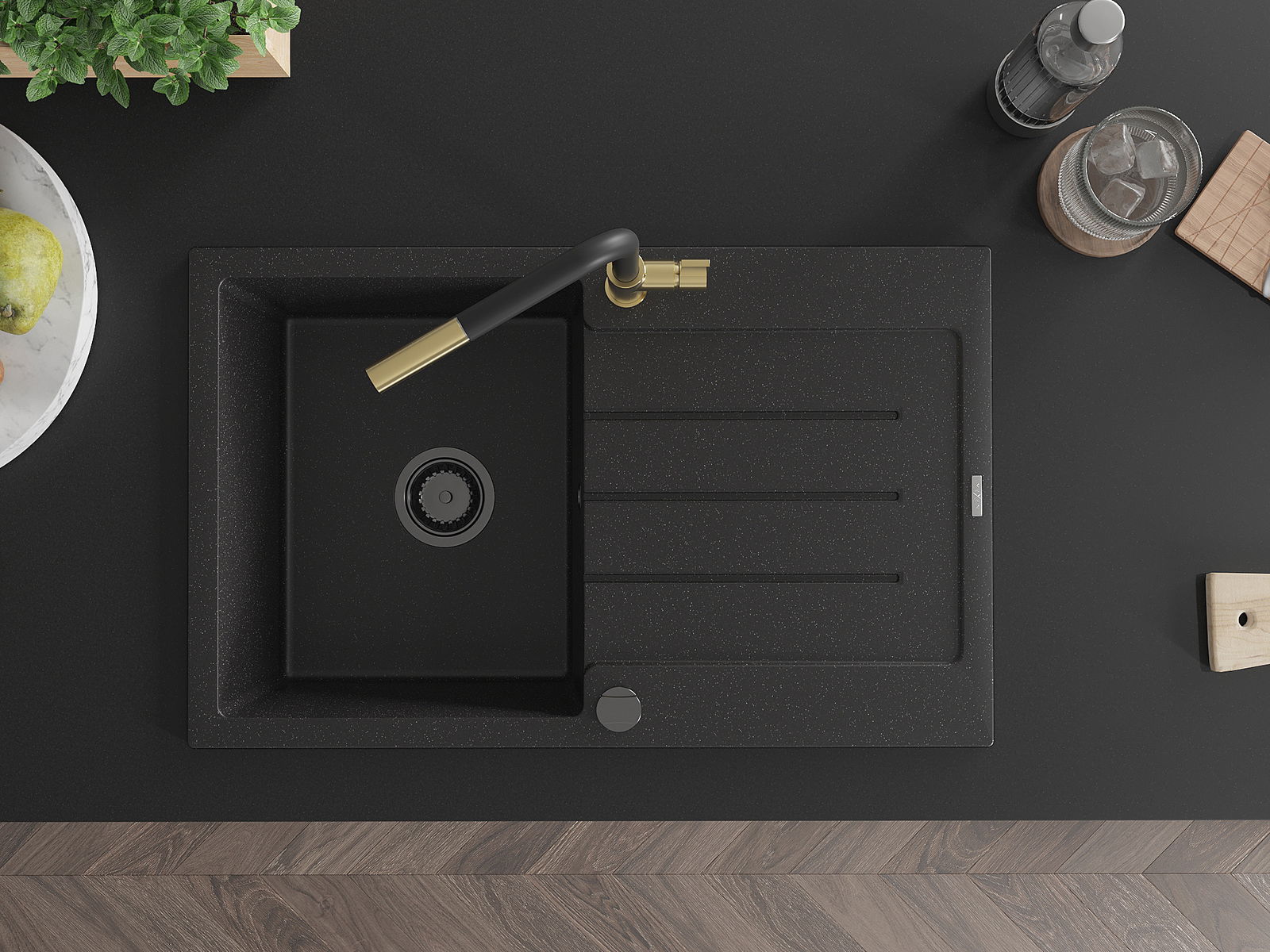 Mexen Bruno évier en granit 1 bac avec égouttoir et robinet de cuisine Flora, noir/métallique argenté - 6513-73-670401-57-B