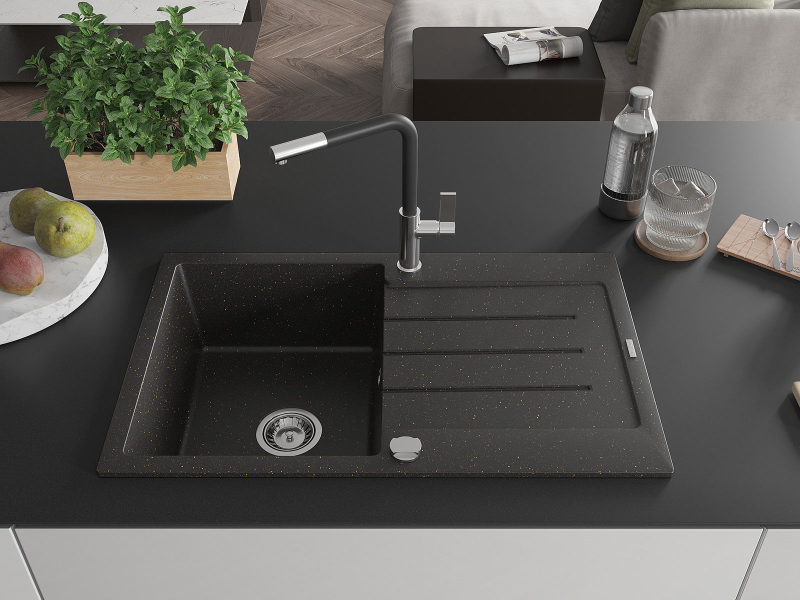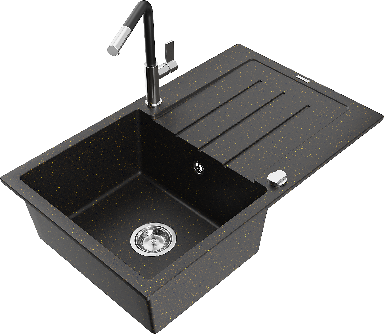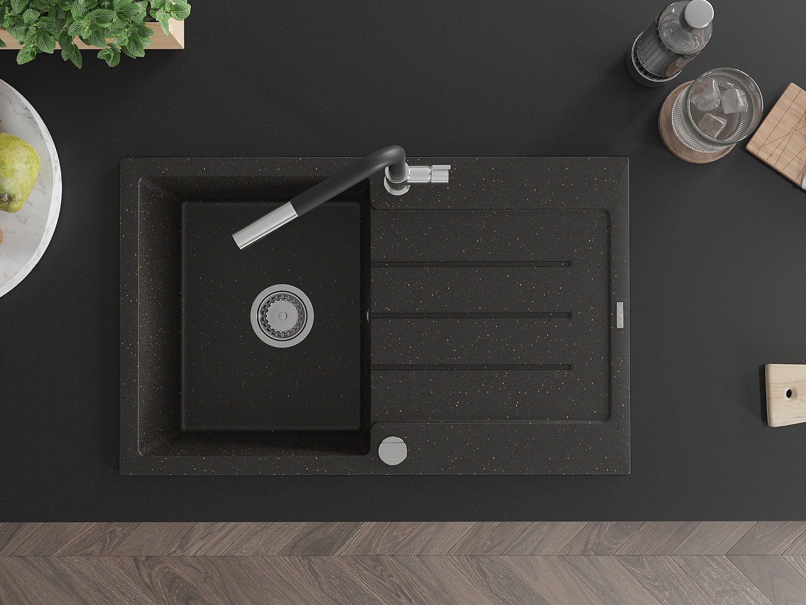 Mexen Bruno évier de cuisine en granit à 1 bac avec égouttoir et robinet de cuisine Flora, noir/or métallisé - 6513-75-670401-0?