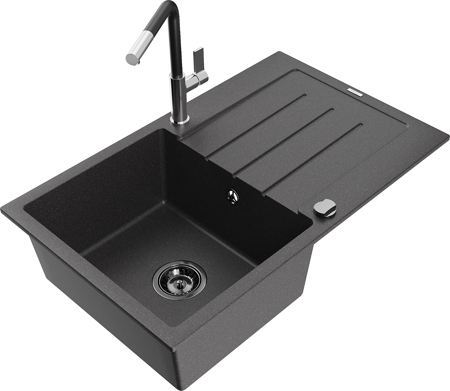 Mexen Bruno évier de cuisine en granit 1 bac avec égouttoir et mitigeur Flora, noir tacheté - 6513-76-670401-07-B