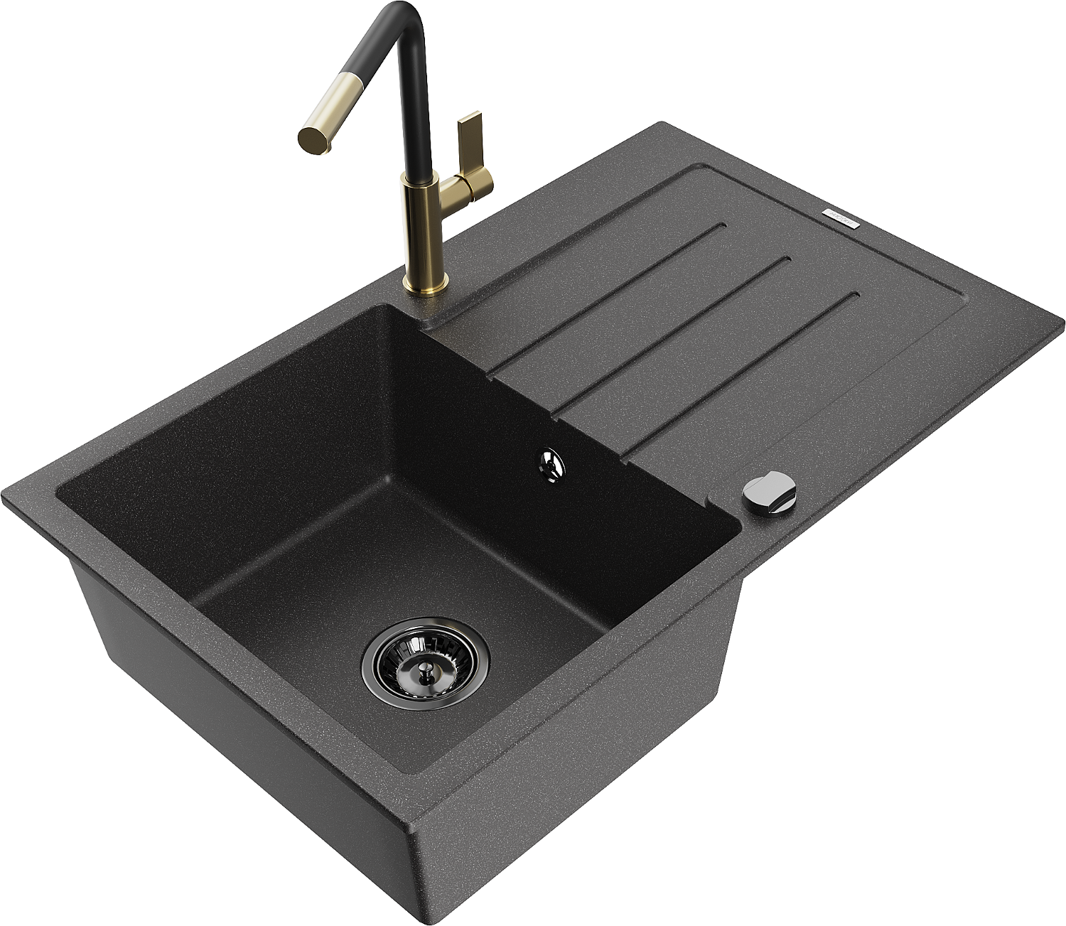 Mexen Bruno évier en granit 1 bac avec égouttoir et mitigeur de cuisine Flora, noir moucheté - 6513-76-670401-57-B