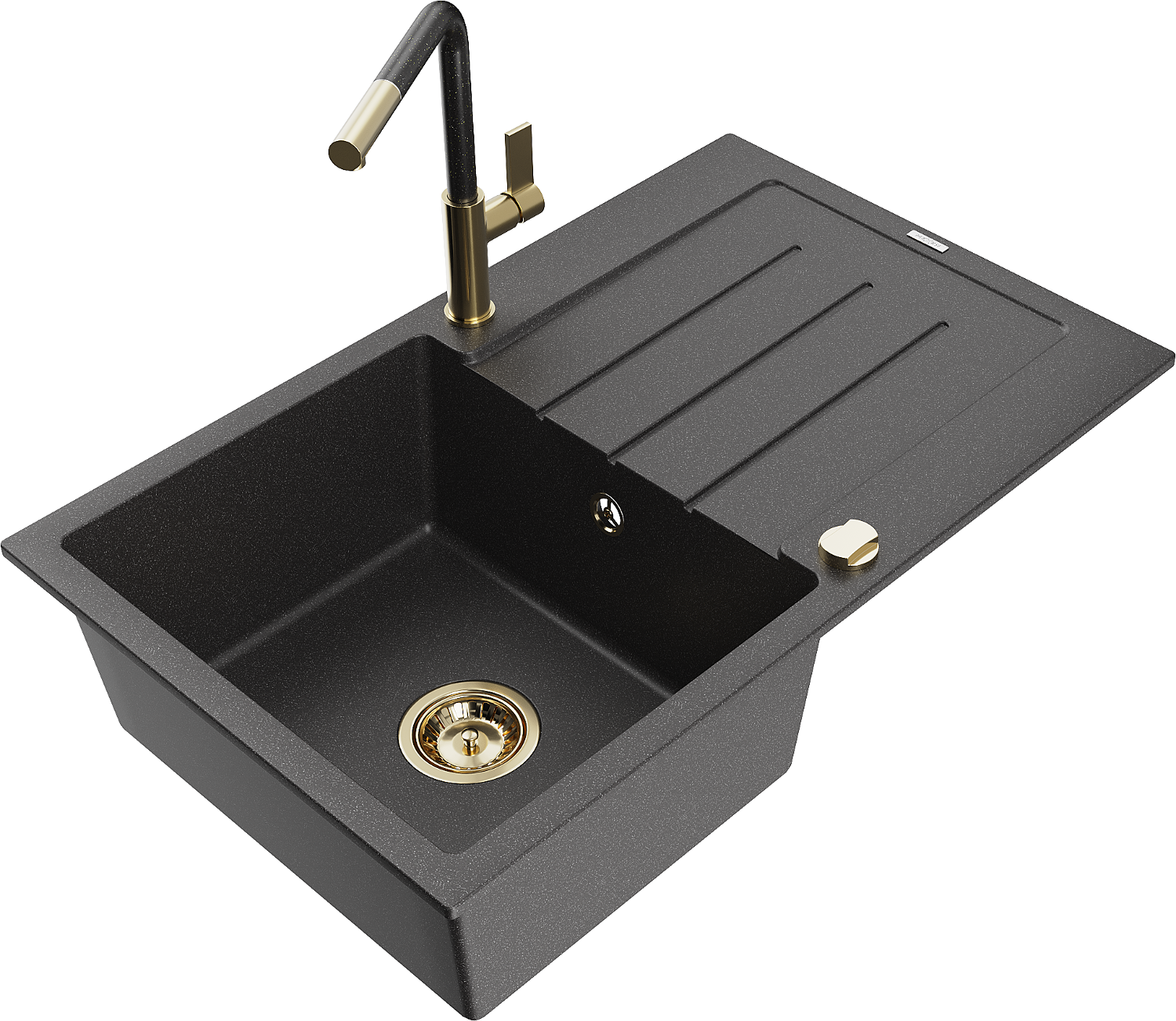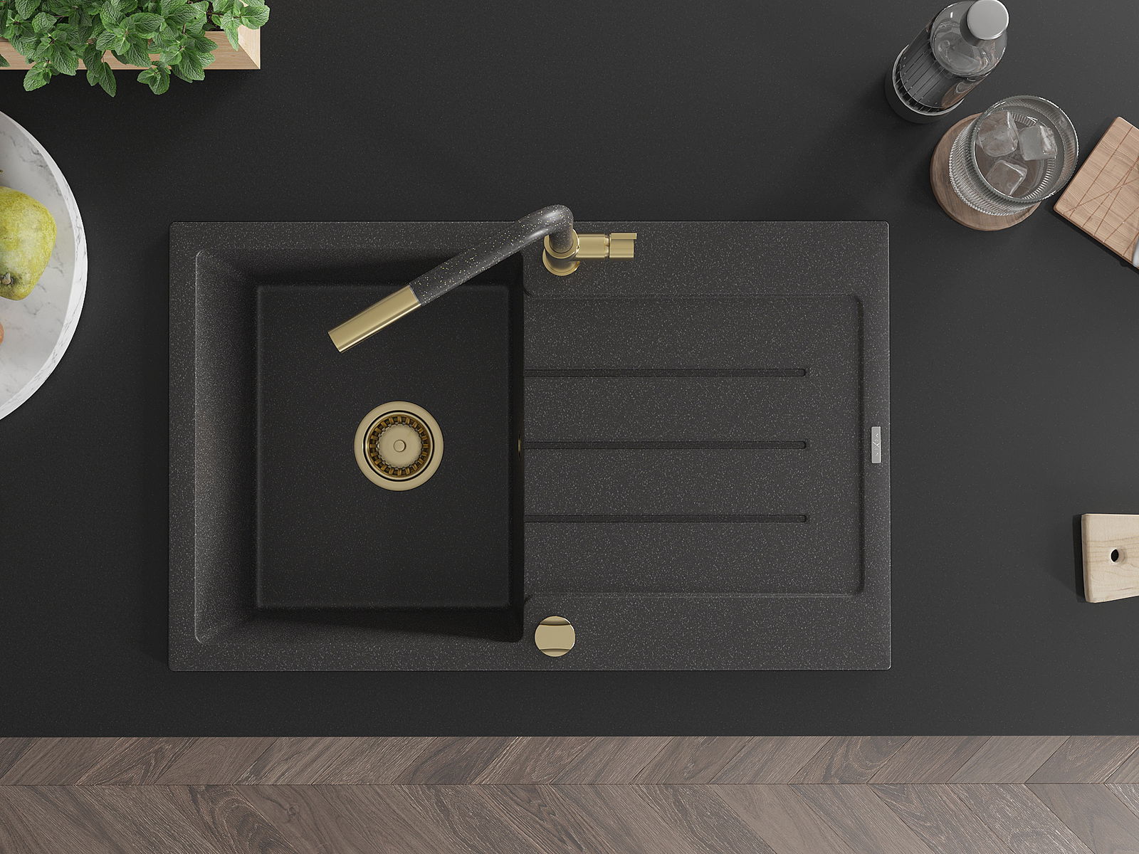Mexen Bruno évier de cuisine en granit 1 bac avec égouttoir et robinet de cuisine Flora, noir moucheté - 6513-76-670401-75-G