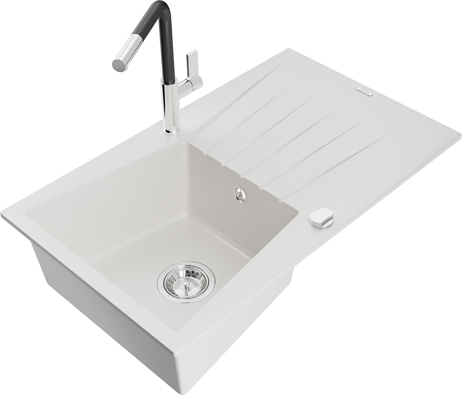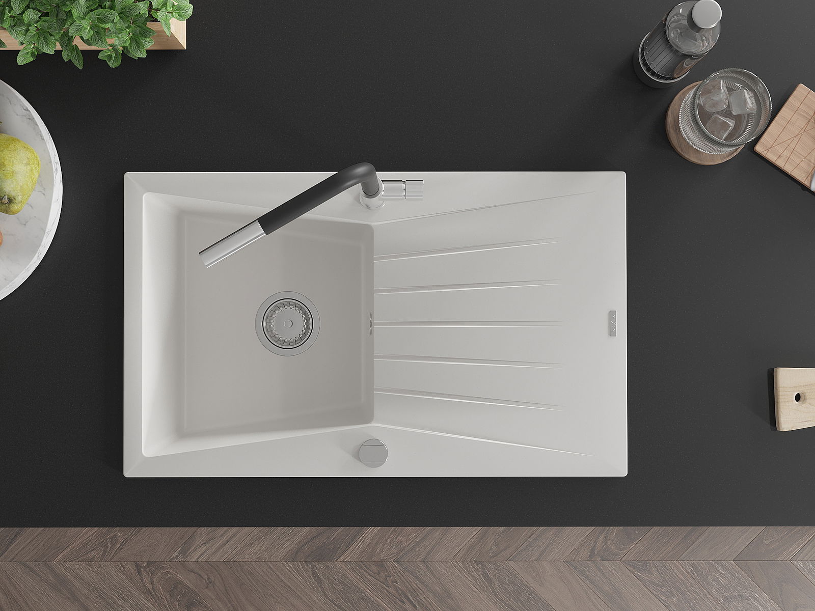Mexen Cesar évier de cuisine en granit 1 bac avec égouttoir et robinet Flora, blanc - 6514-20-670401-07