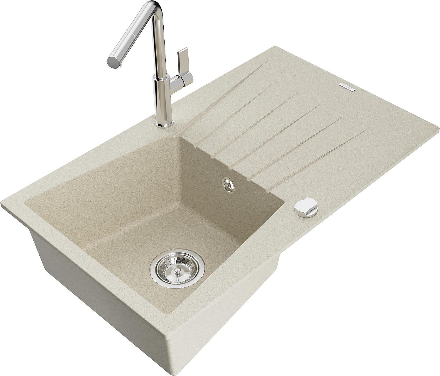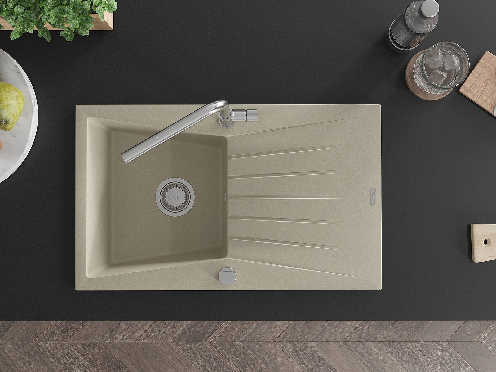 Mexen Cesar évier en granit 1 bac avec égouttoir et mitigeur de cuisine Flora, beige - 6514-69-670401-00