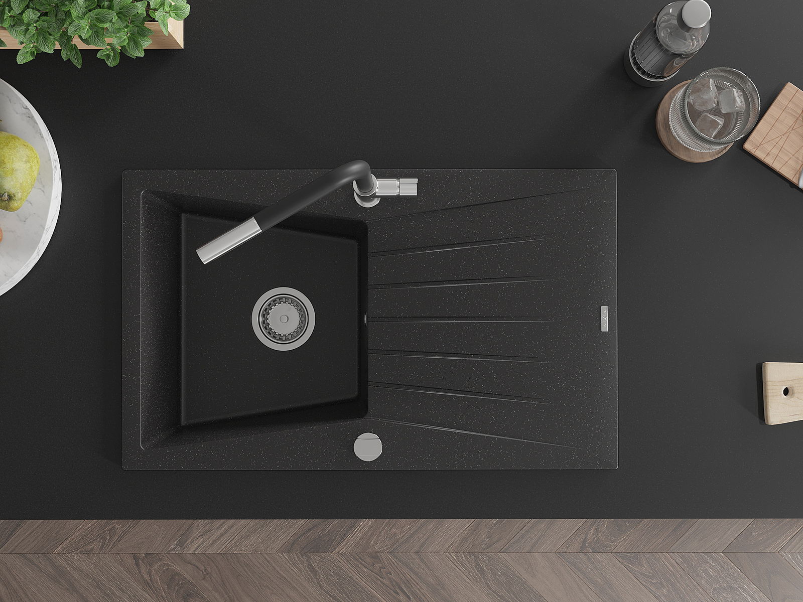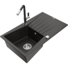 Mexen Cesar évier en granit 1 bac avec égouttoir et robinet de cuisine Flora, noir/métal argenté - 6514-73-670401-07
