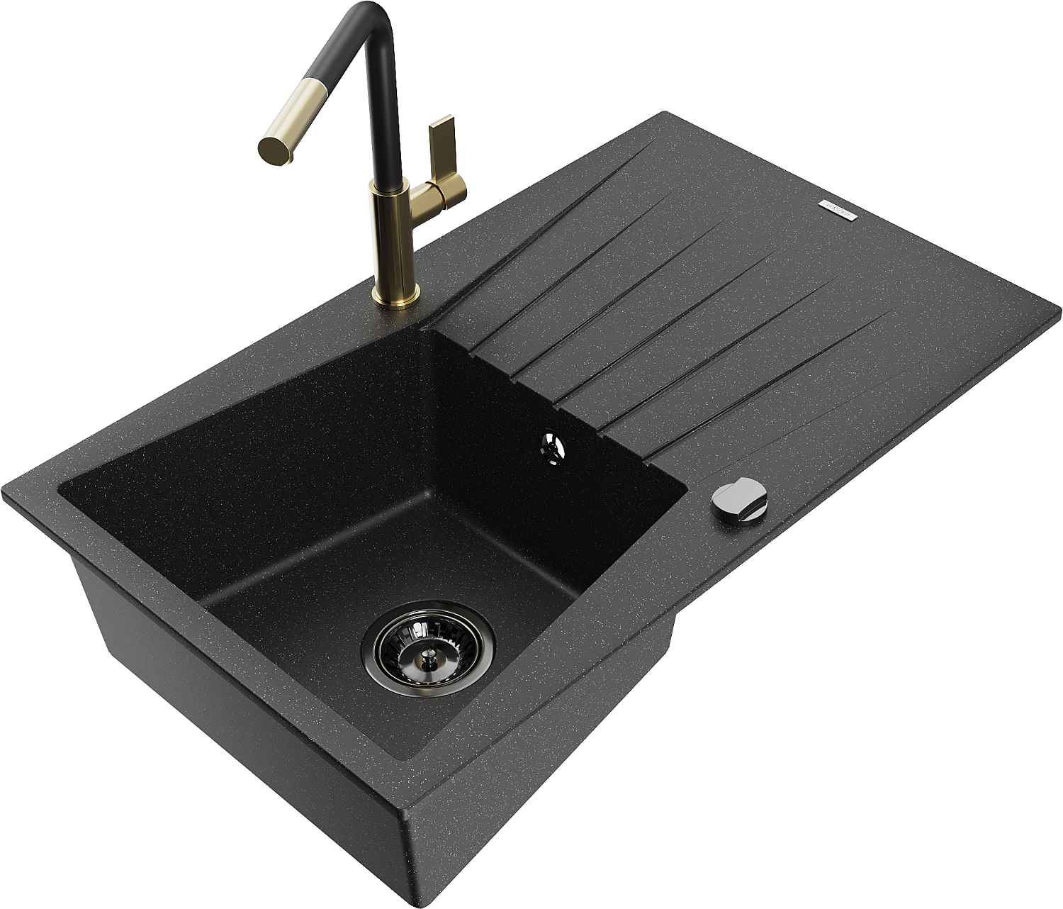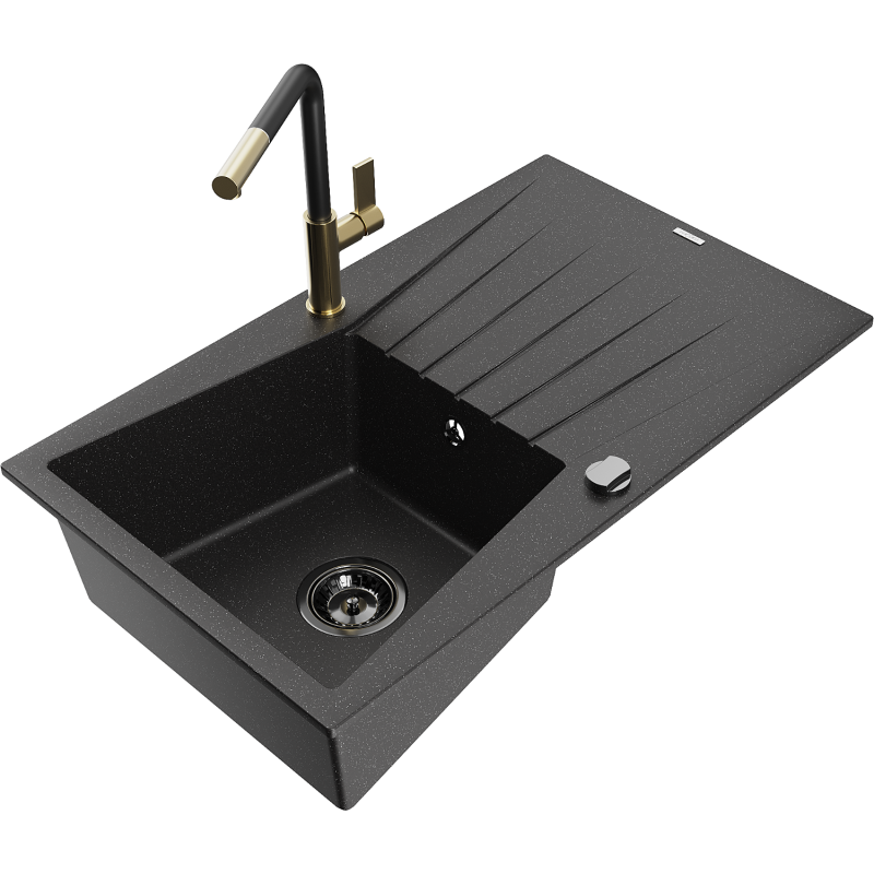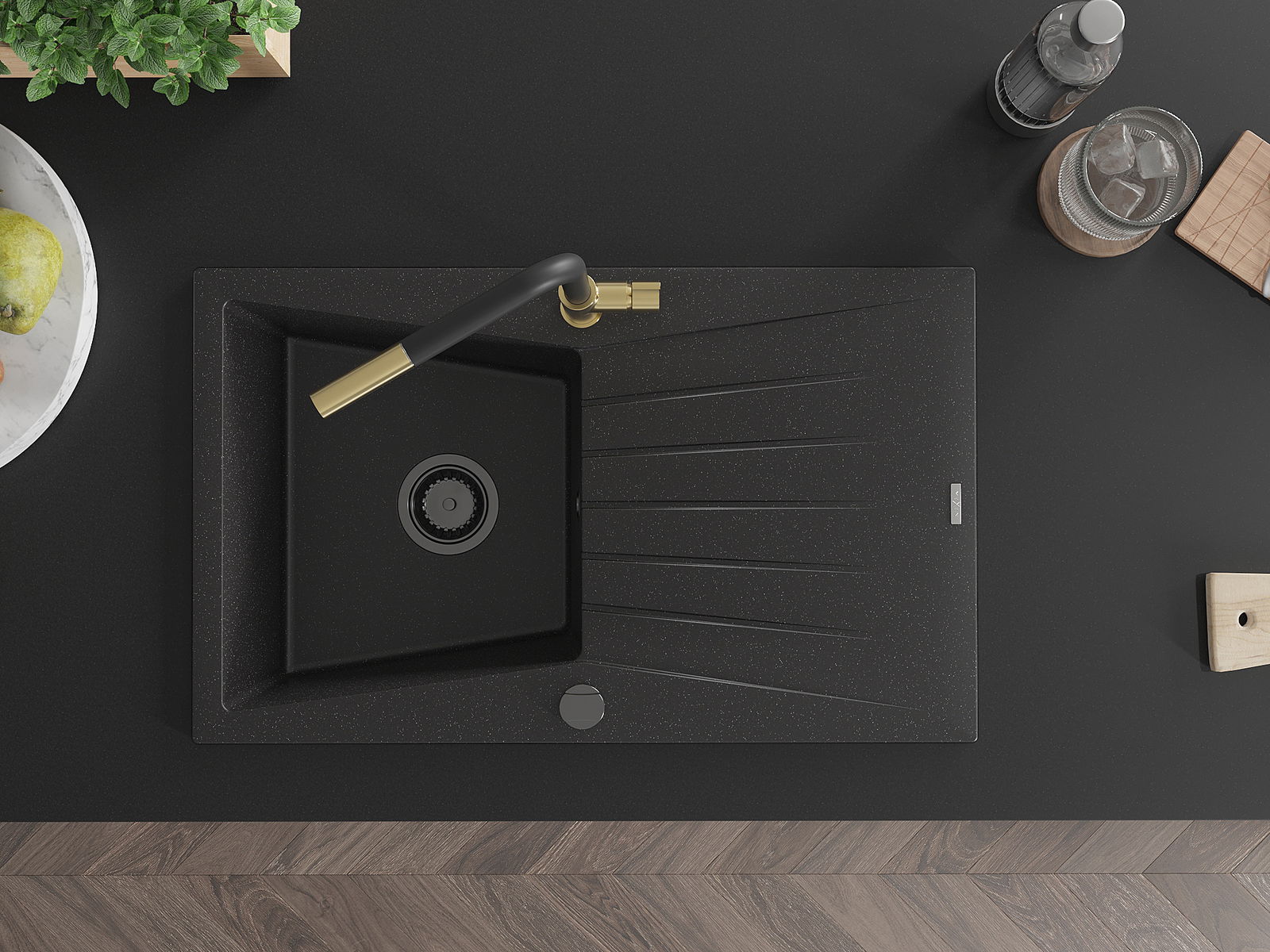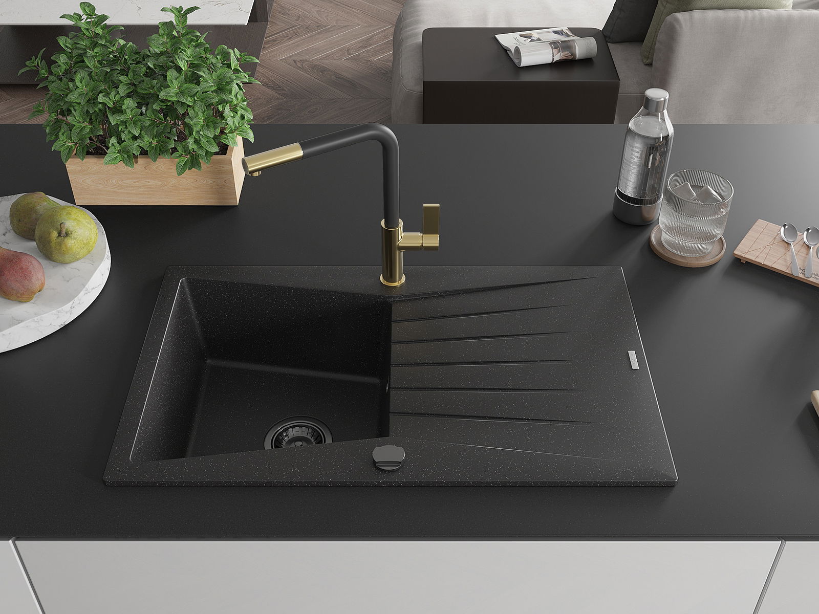 Mexen Cesar évier en granit 1 bac avec égouttoir et robinet de cuisine Flora, noir/métallique argenté - 6514-73-670401-57-B