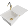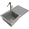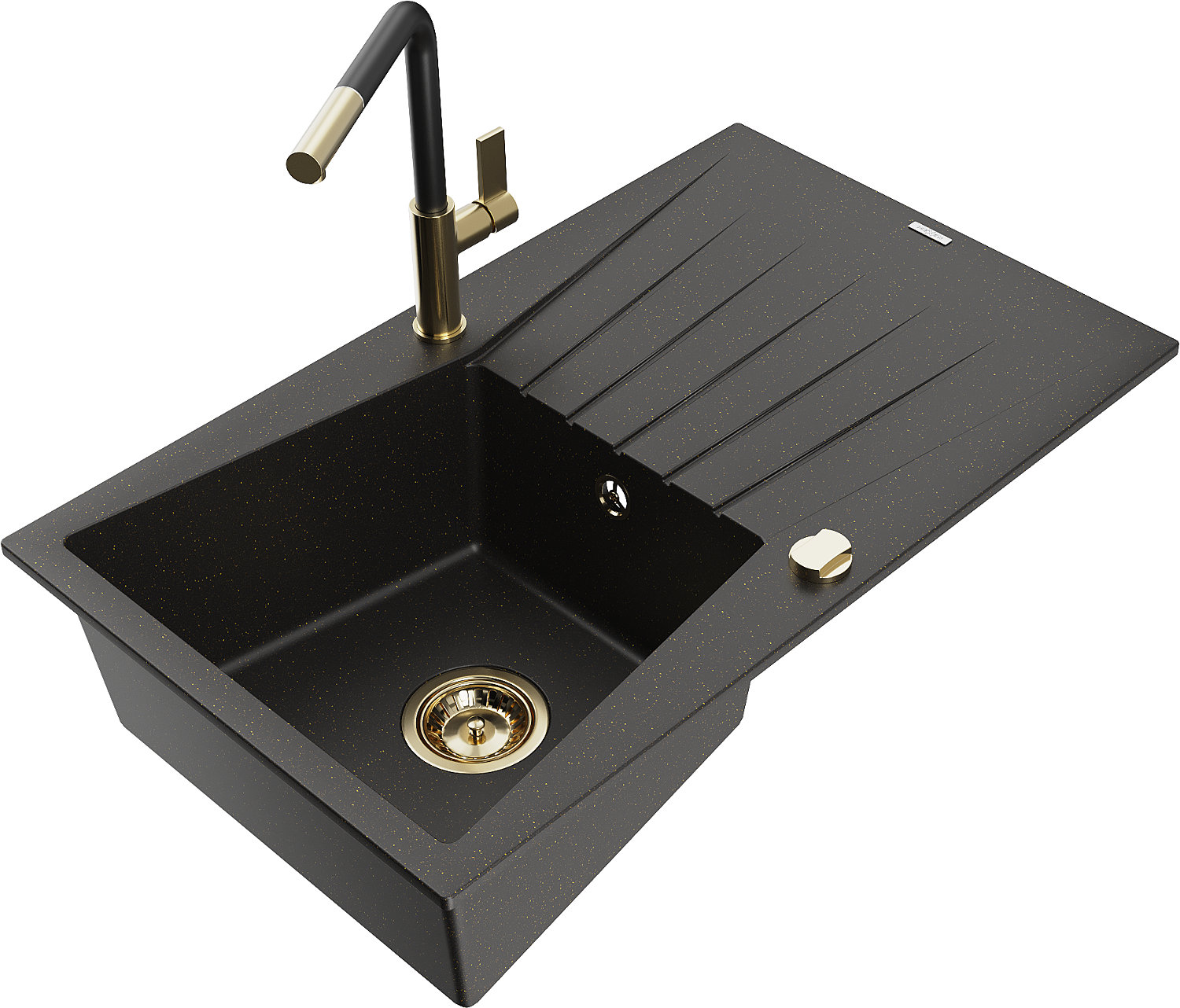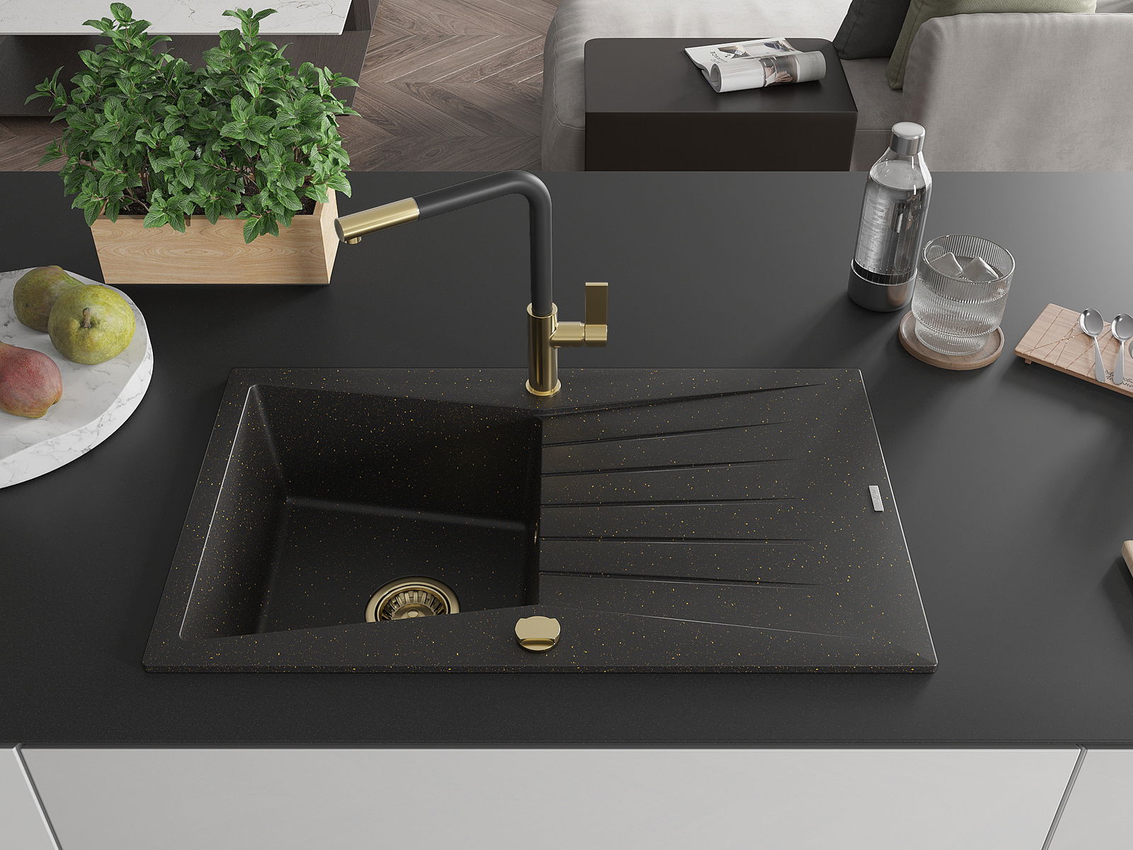 Mexen Cesar évier en granit 1 bac avec égouttoir et robinet de cuisine Flora, noir/doré métallisé - 6514-75-670401-57-G