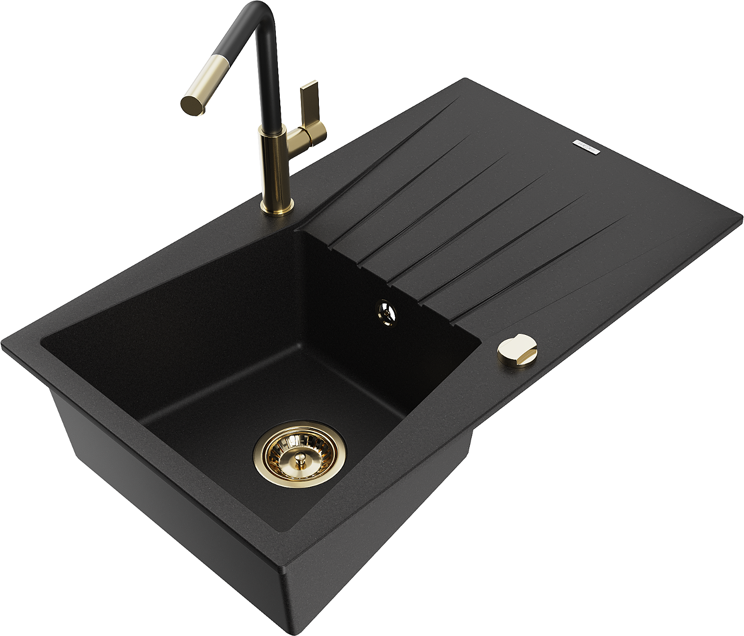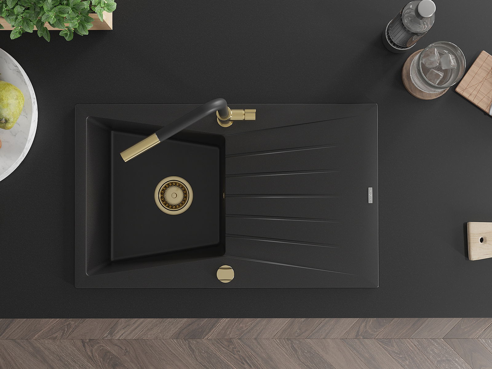 Mexen Cesar évier en granit 1 bac avec égouttoir et robinet de cuisine Flora, noir - 6514-77-670401-57-G