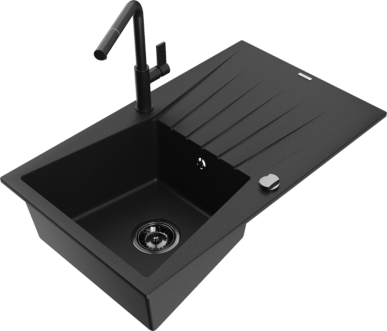 Mexen Cesar évier en granit 1 bac avec égouttoir et robinet de cuisine Flora, noir - 6514-77-670401-70-B