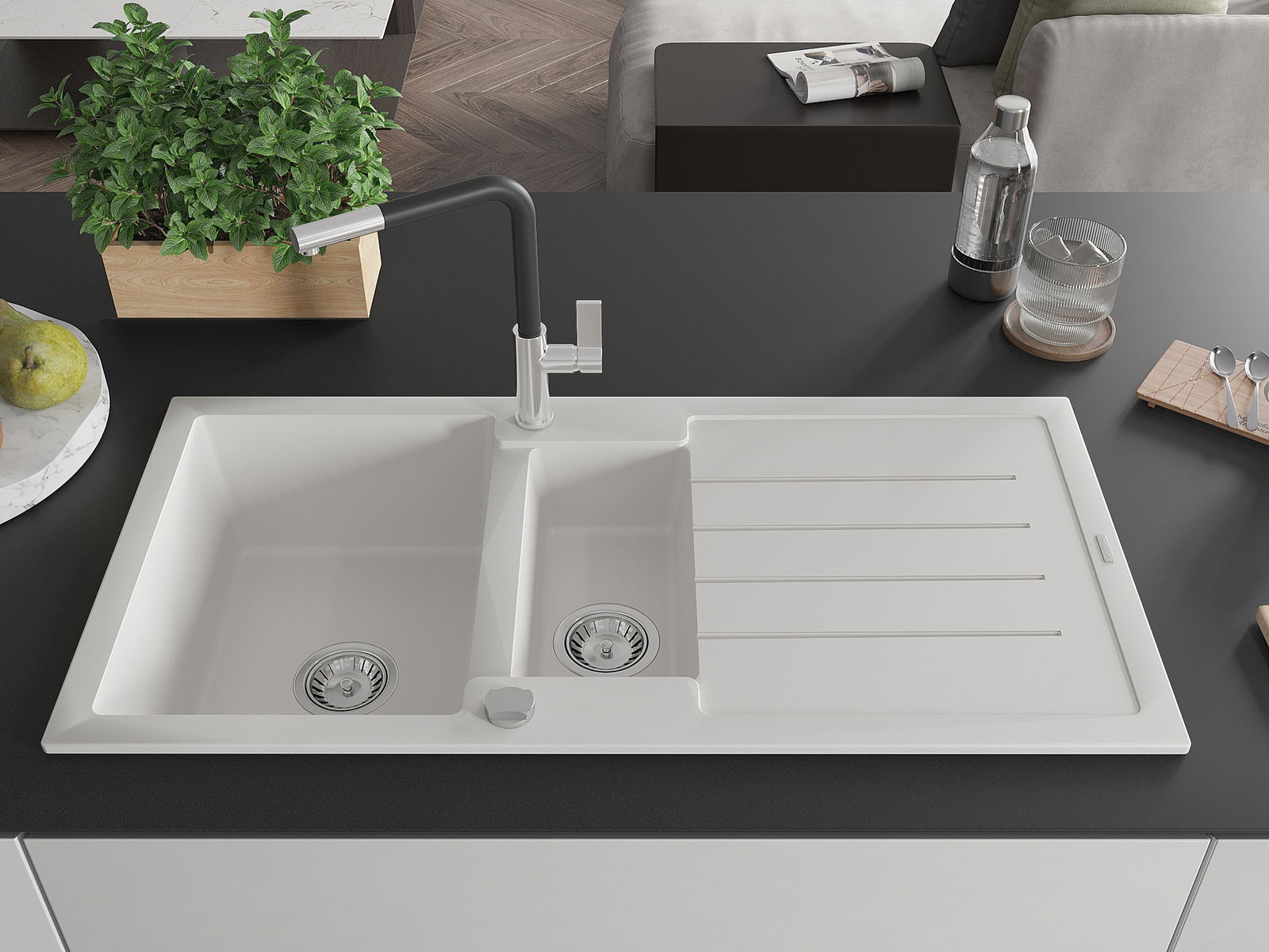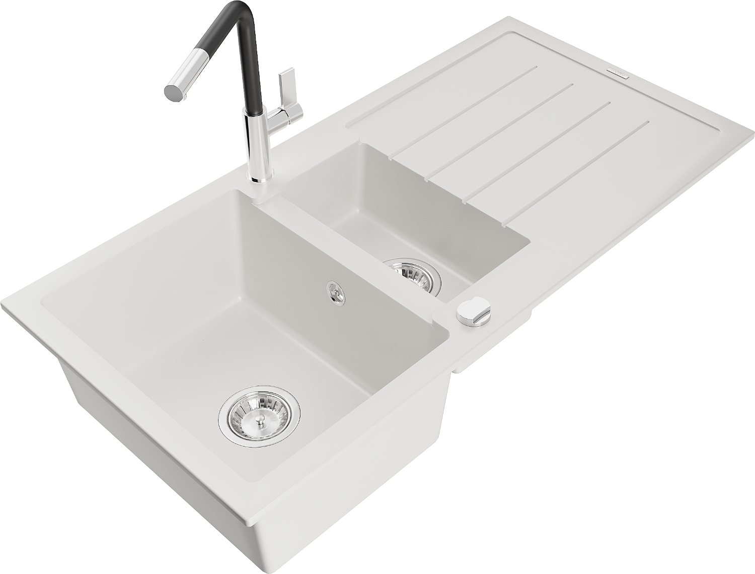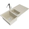 Mexen Andres évier en granit 1,5-bac avec égouttoir et robinet de cuisine Flora, blanc - 6515-20-670401-07