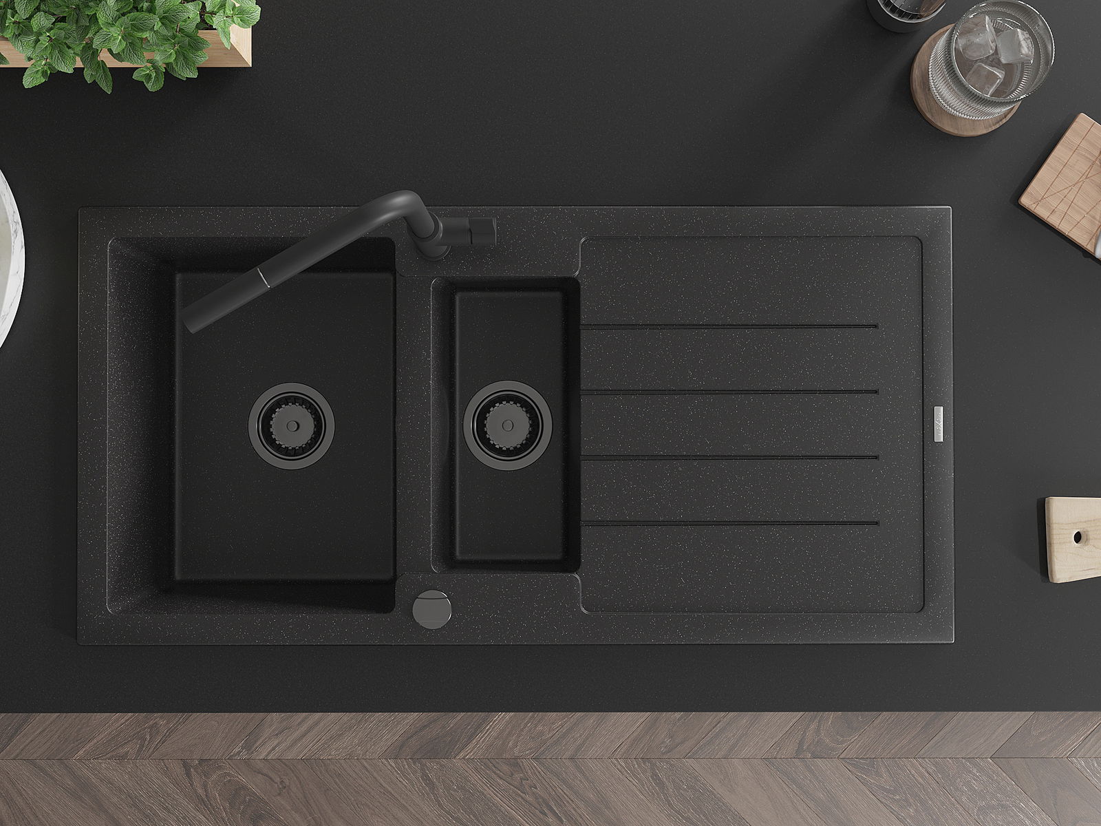 Mexen Andres évier en granit 1,5 bac avec égouttoir et robinet de cuisine Flora, noir/argent - 6515-73-670401-70-B
