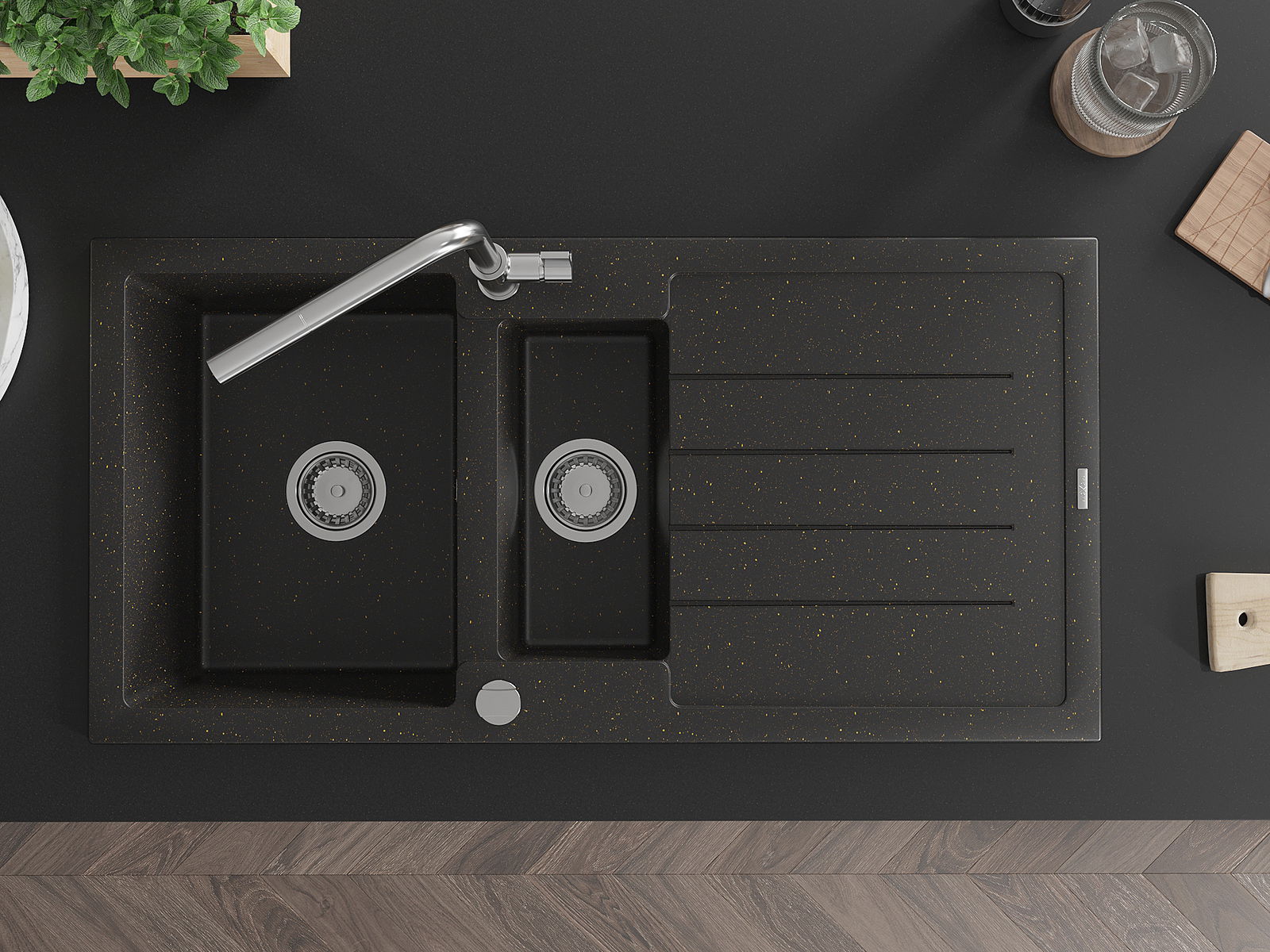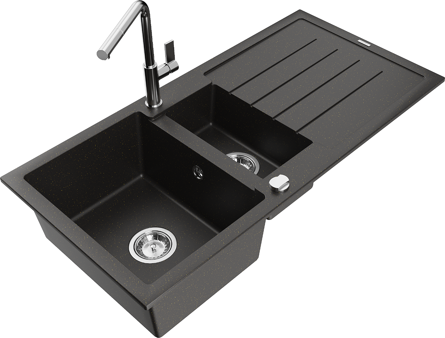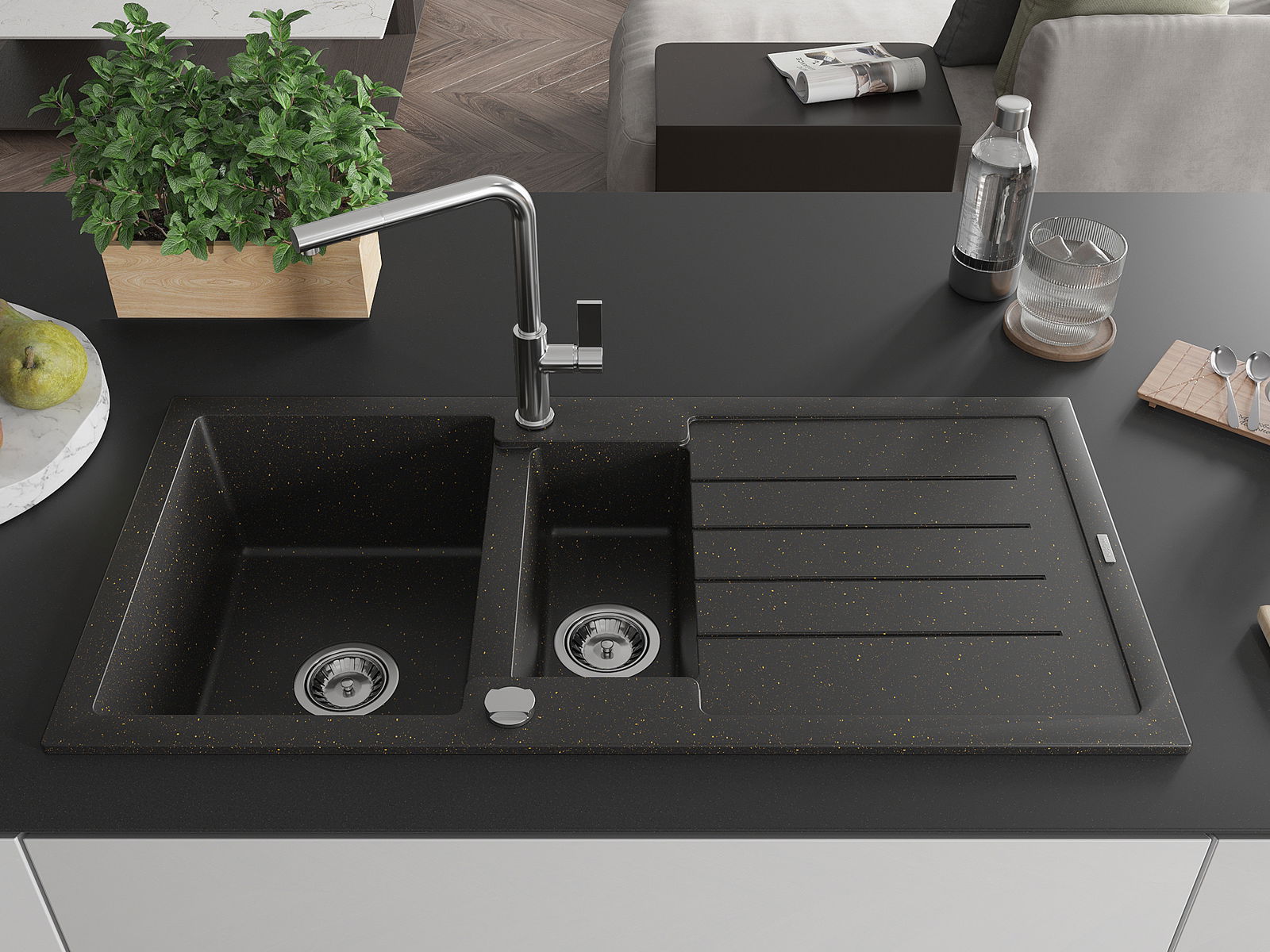 Mexen Andres évier en granit 1,5 bac avec égouttoir et robinet de cuisine Flora, noir/or métallique - 6515-75-670401-00