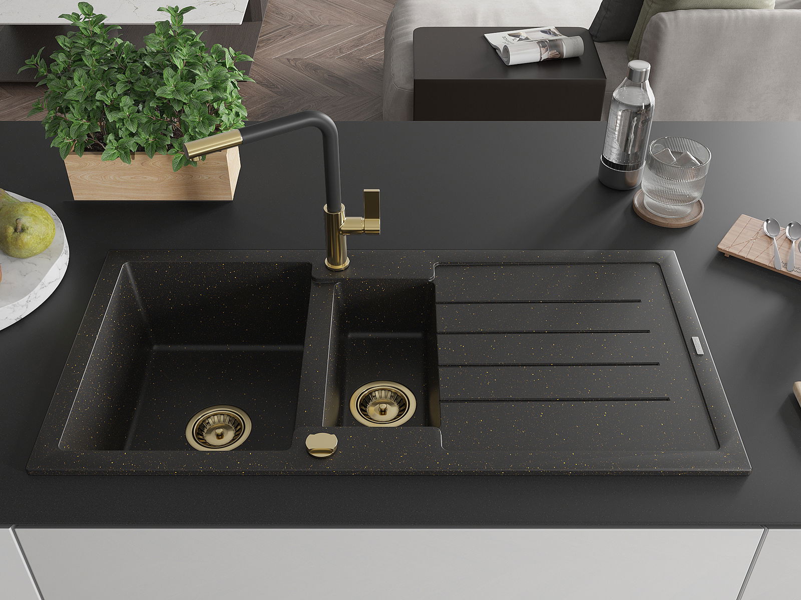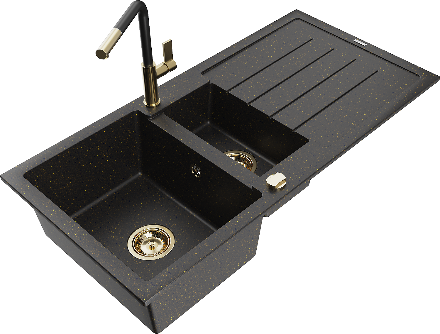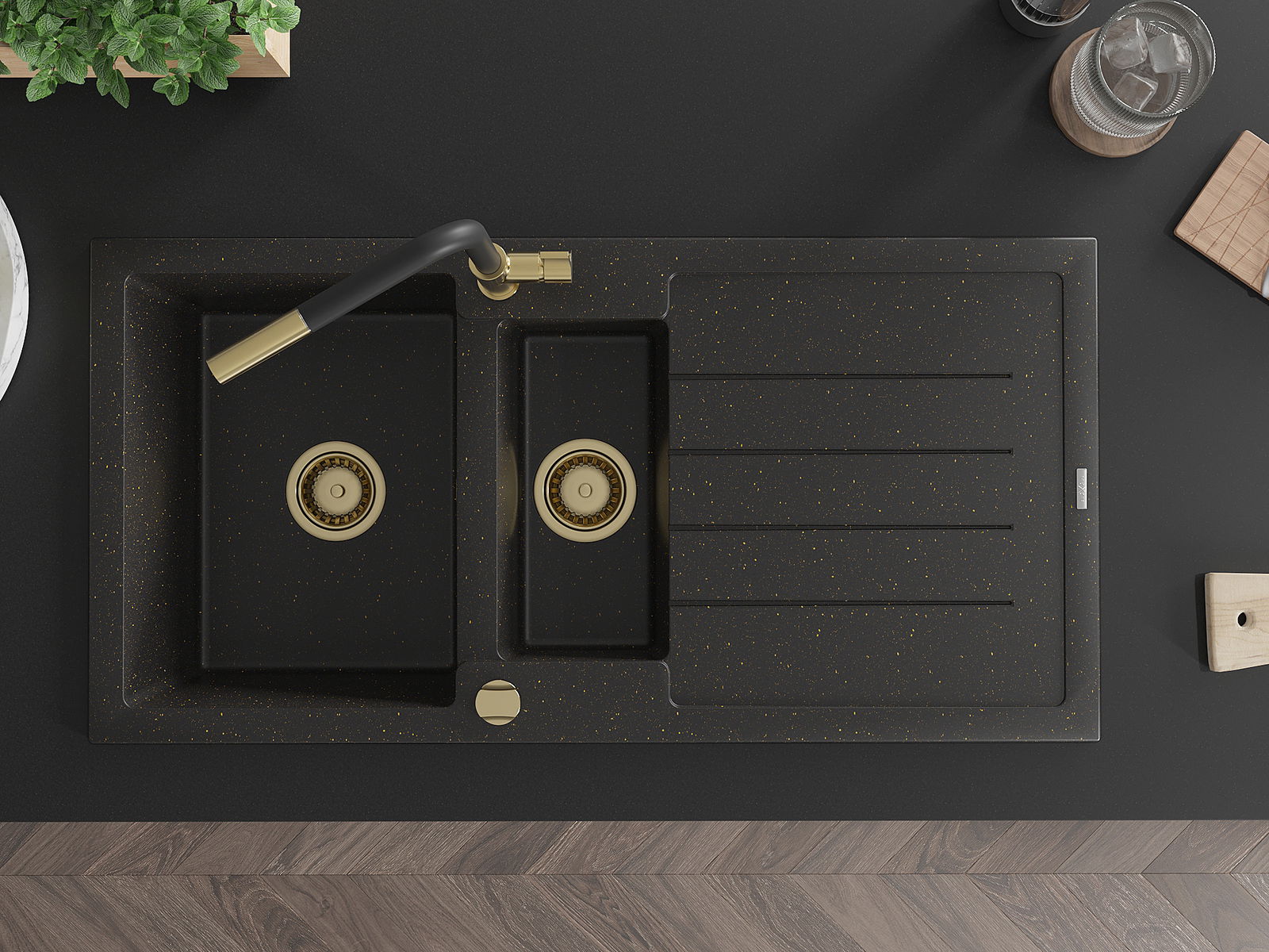 Mexen Andres évier en granit 1,5 bac avec égouttoir et robinet de cuisine Flora, noir/or - 6515-75-670401-57-G