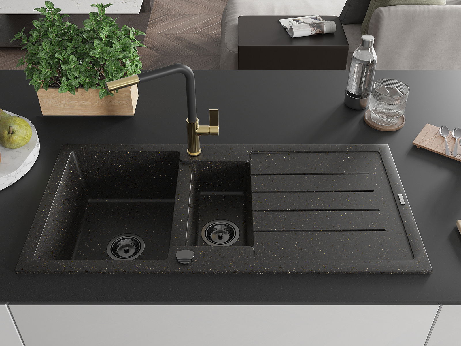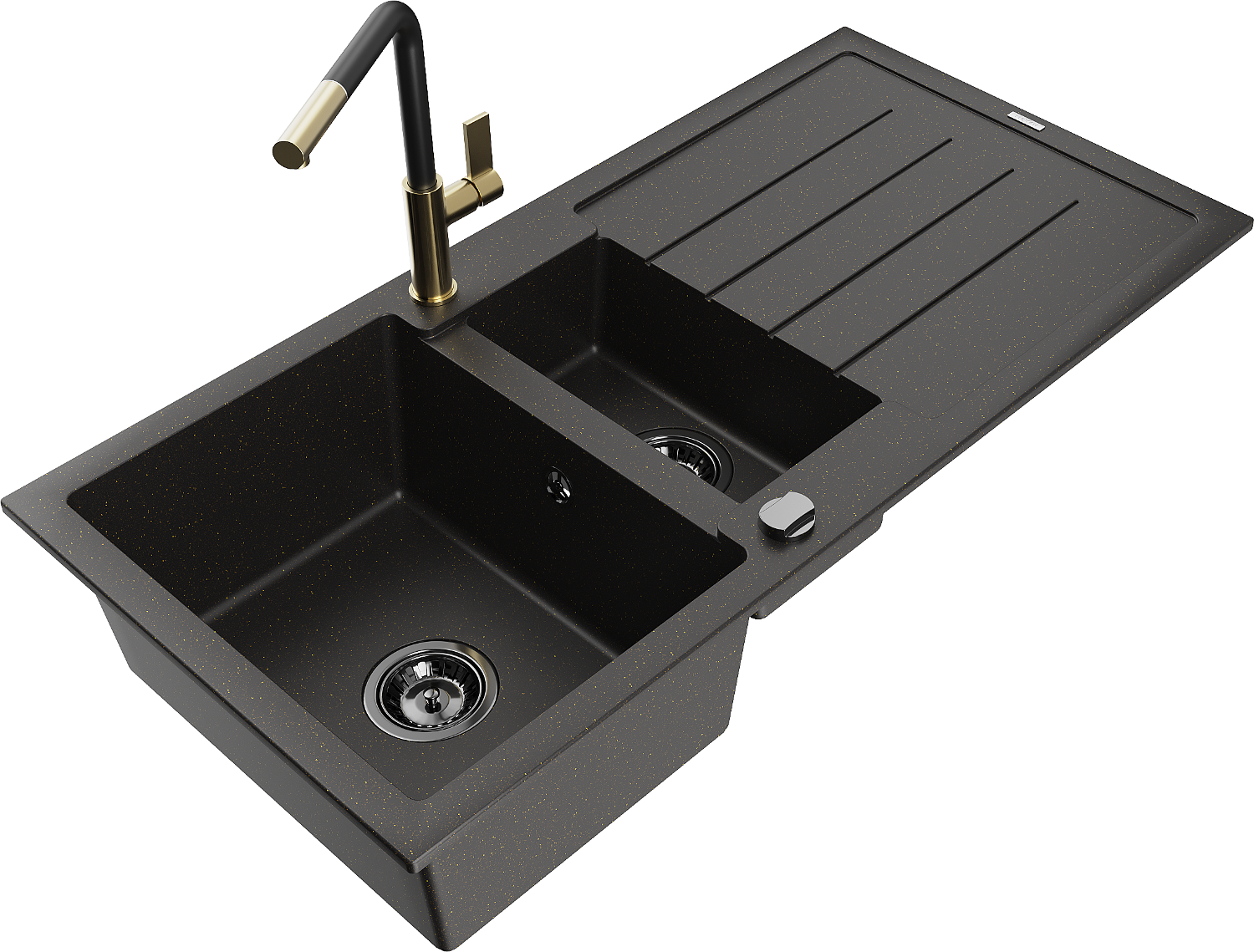 Mexen Andres évier en granit 1,5 bac avec égouttoir et robinet de cuisine Flora, noir/or - 6515-75-670401-57-B