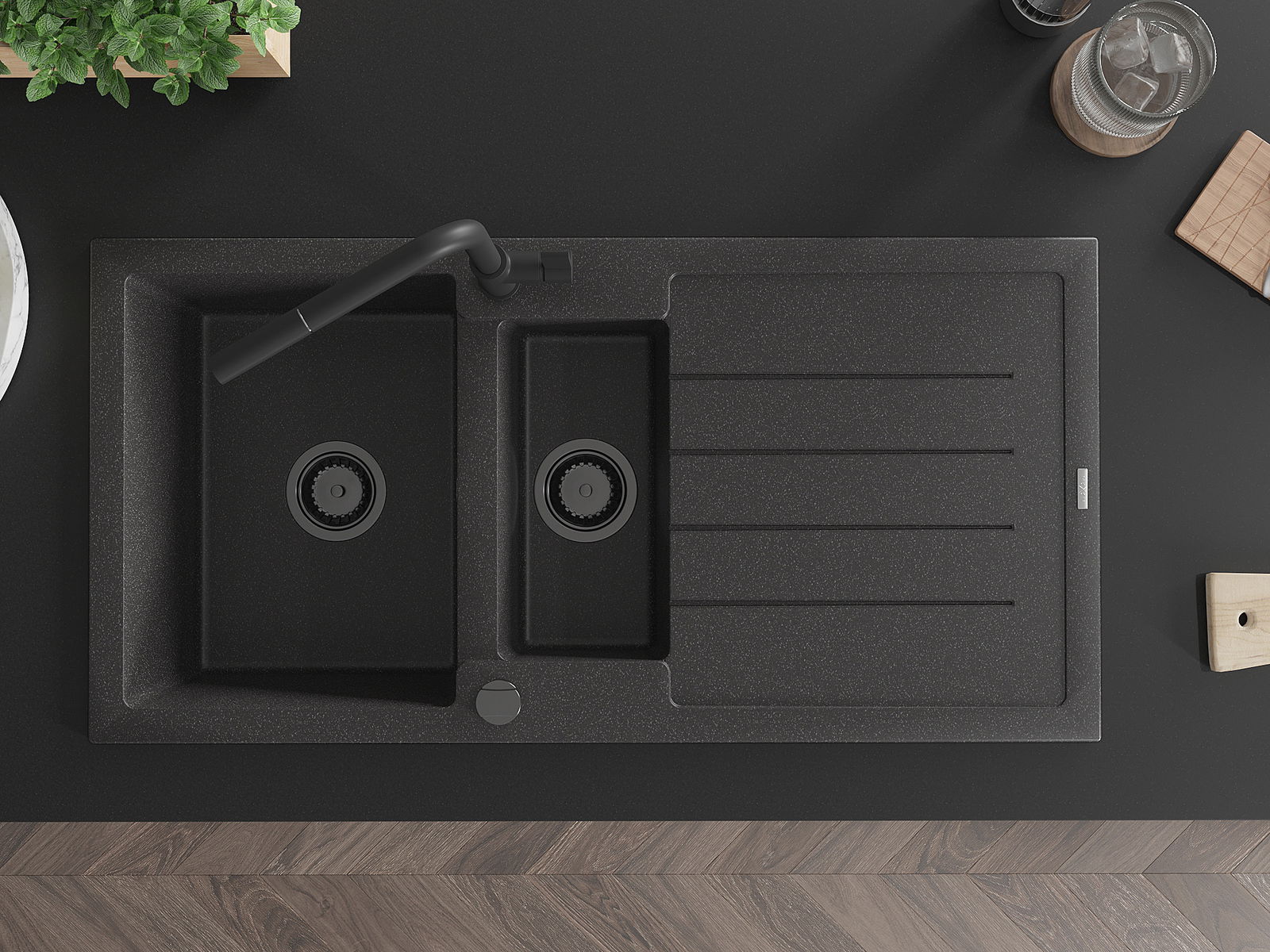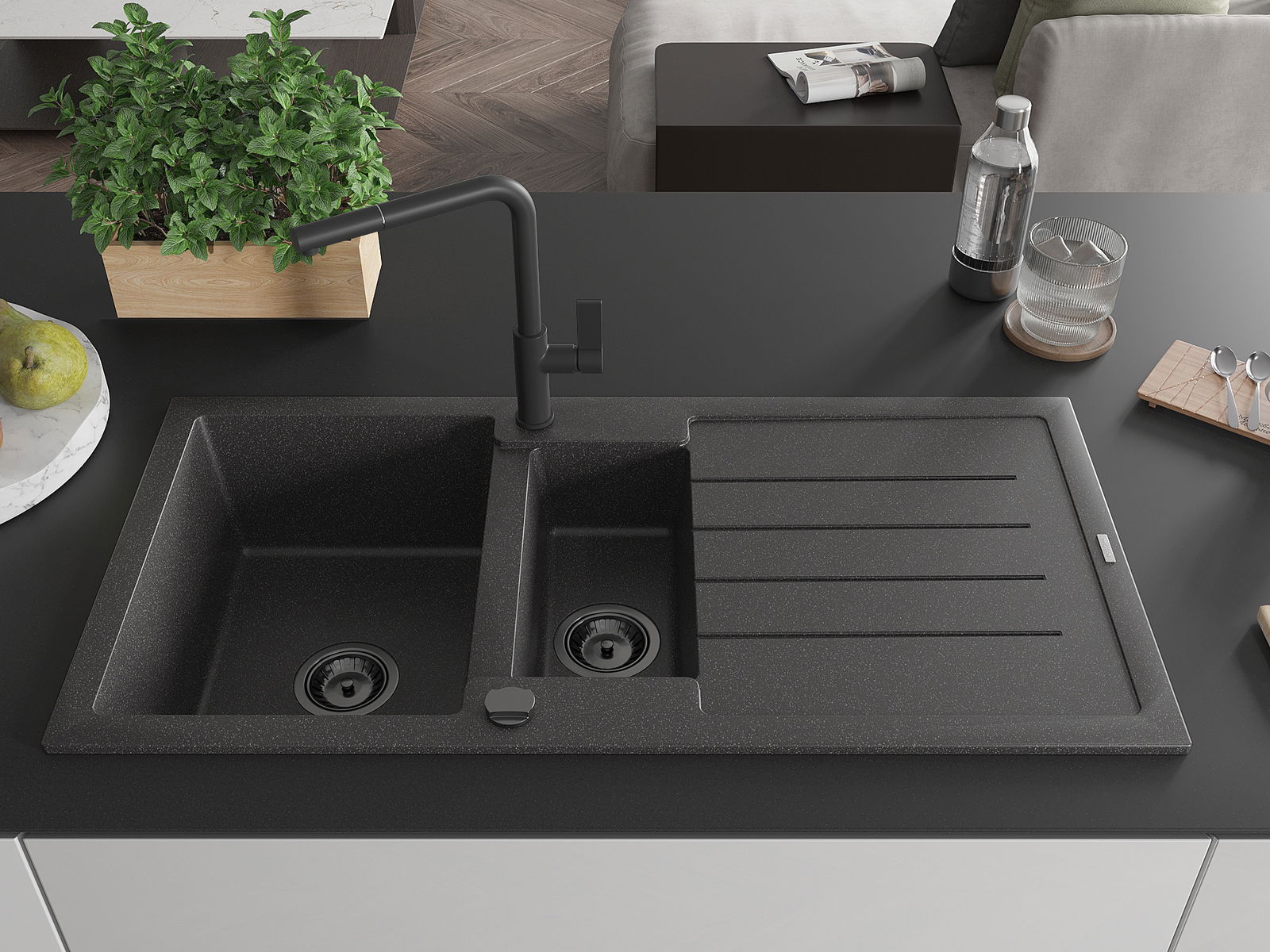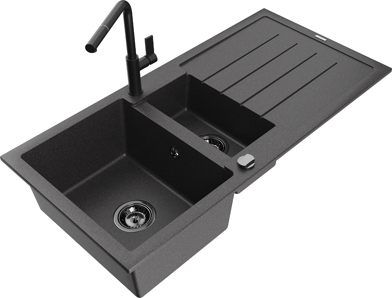 Mexen Andres évier en granit 1,5 bac avec égouttoir et robinet de cuisine Flora, noir moucheté - 6515-76-670401-70-B